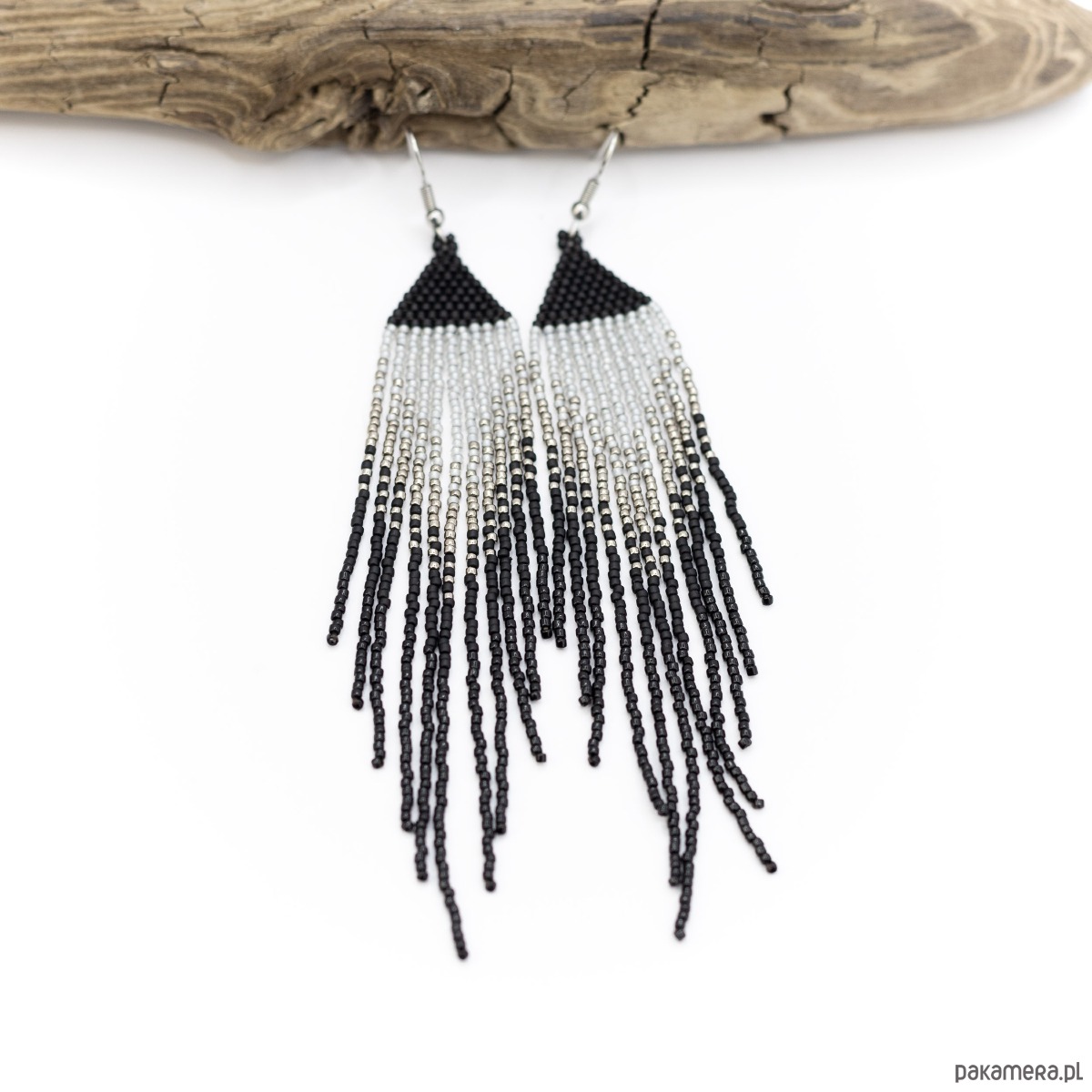 Kolczyki koralikowe cieniowane kolorami: czarnym, szarym, srebrnym.