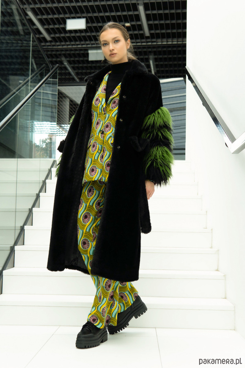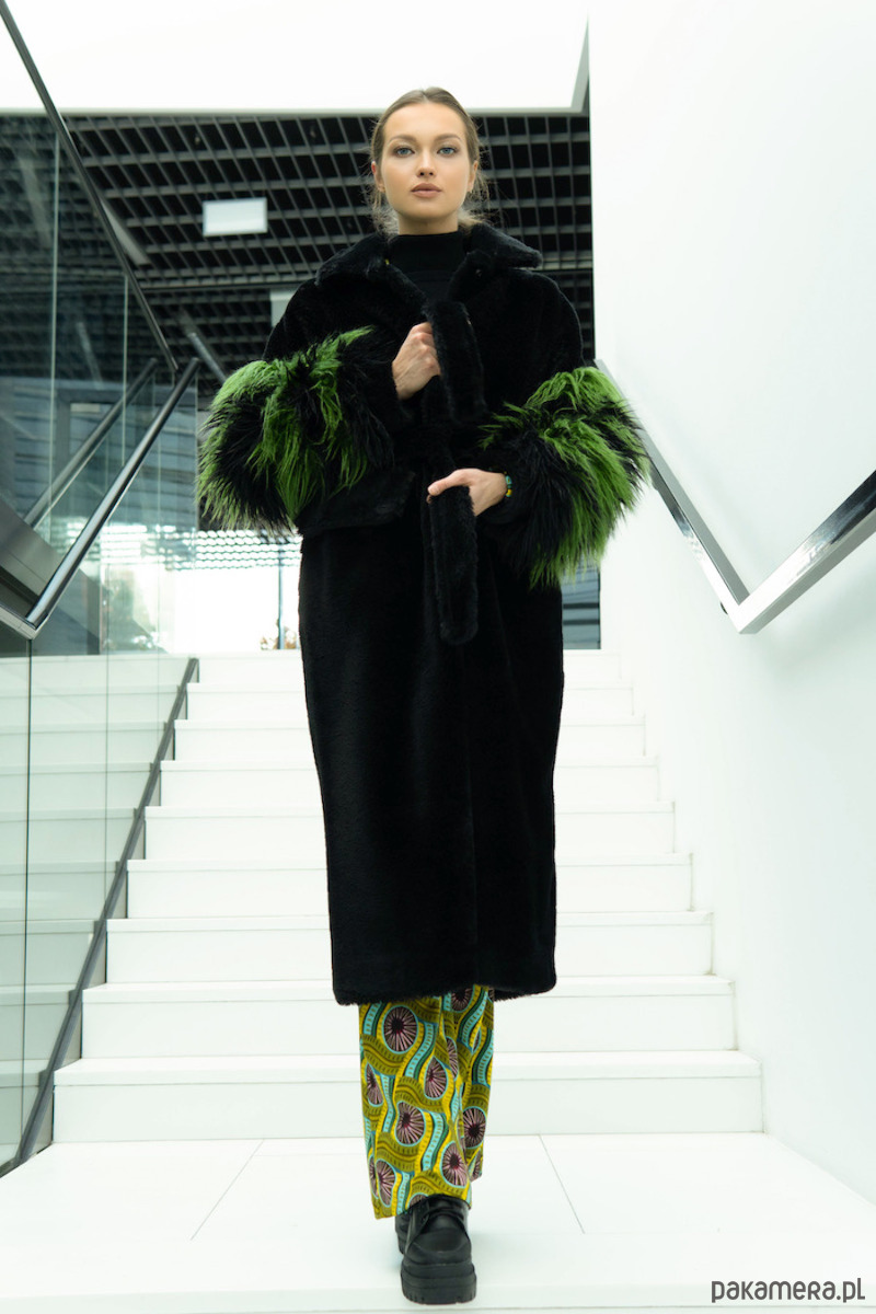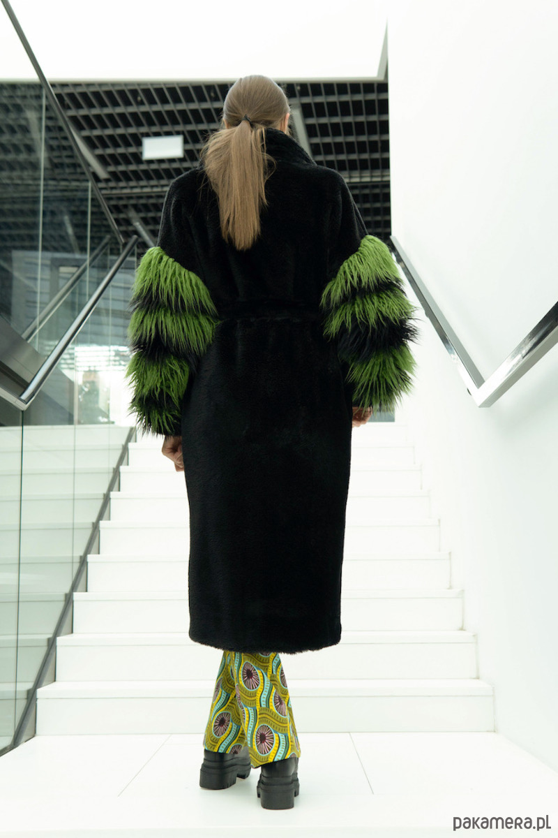 Czarno-zielony płaszcz ze sztucznego futra z puszystymi rękawami