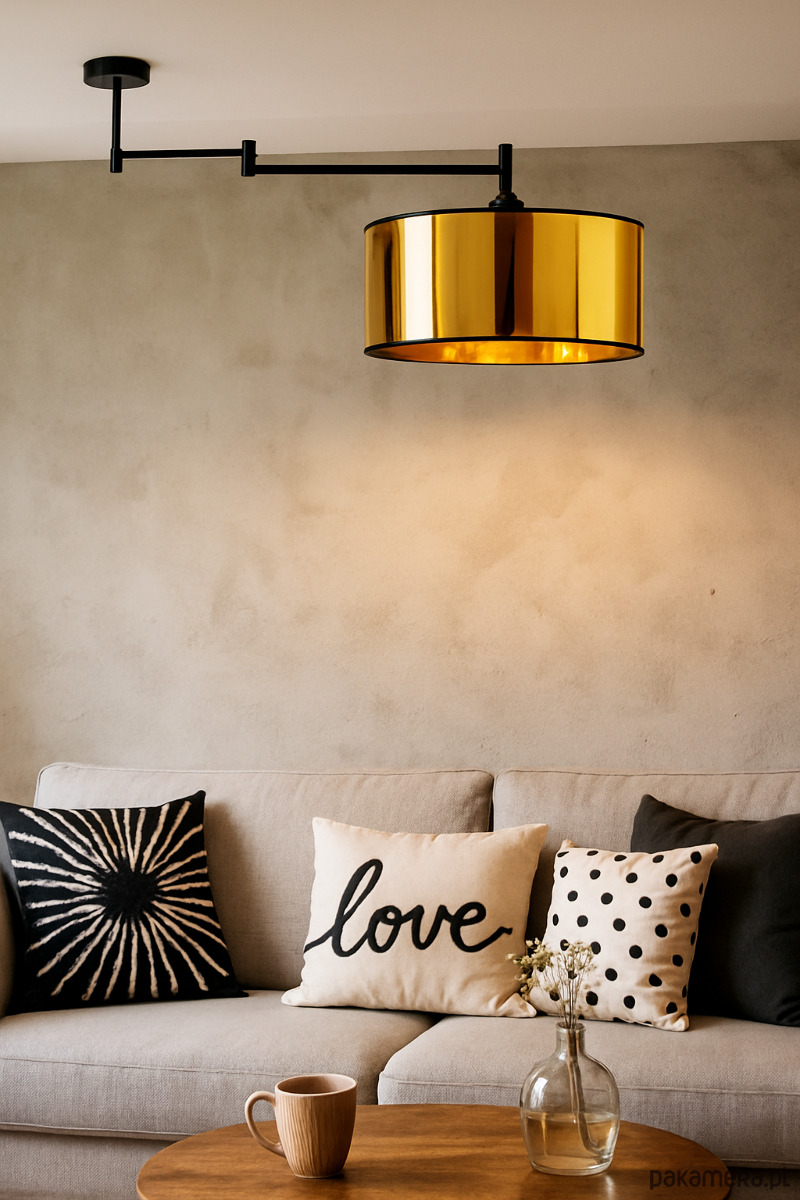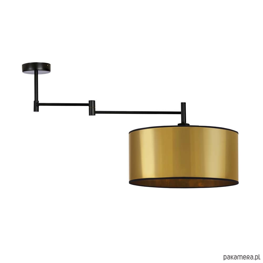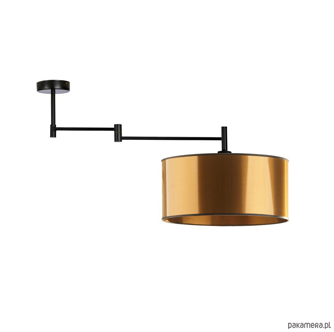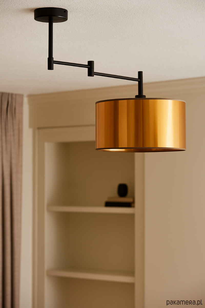 Plafon z regulowanym ramieniem charakteryzuje się nie tylko użytecznością ale także designerskim wyglądem. Abażur w kształcie walca i kolorze złota tworzy spójną całość z czarnym zwisem. Nowatorski abażur wyprodukowano z materiału PVC, którego powierzchnia przypomina taflę lustra w której można się dosłownie przejrzeć.