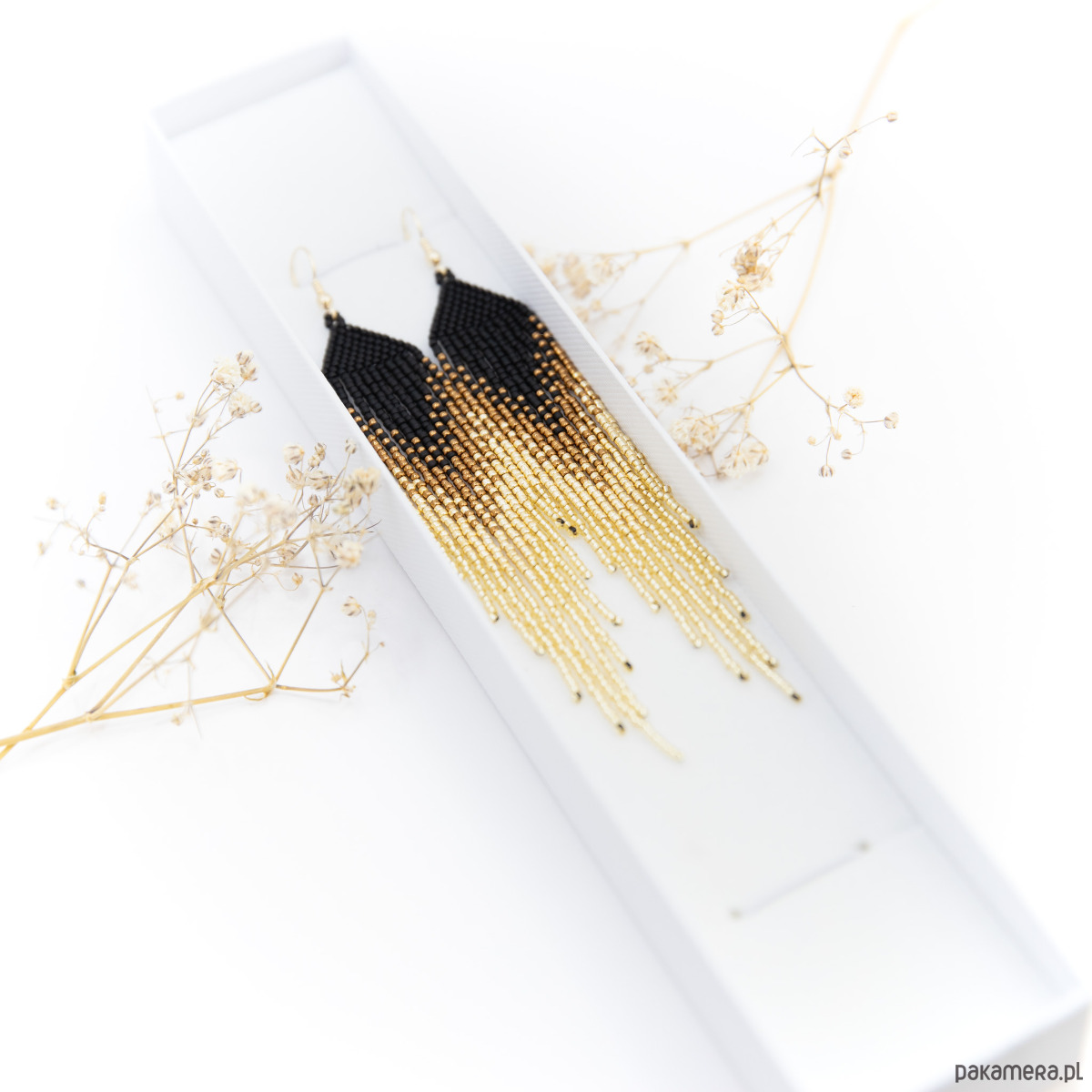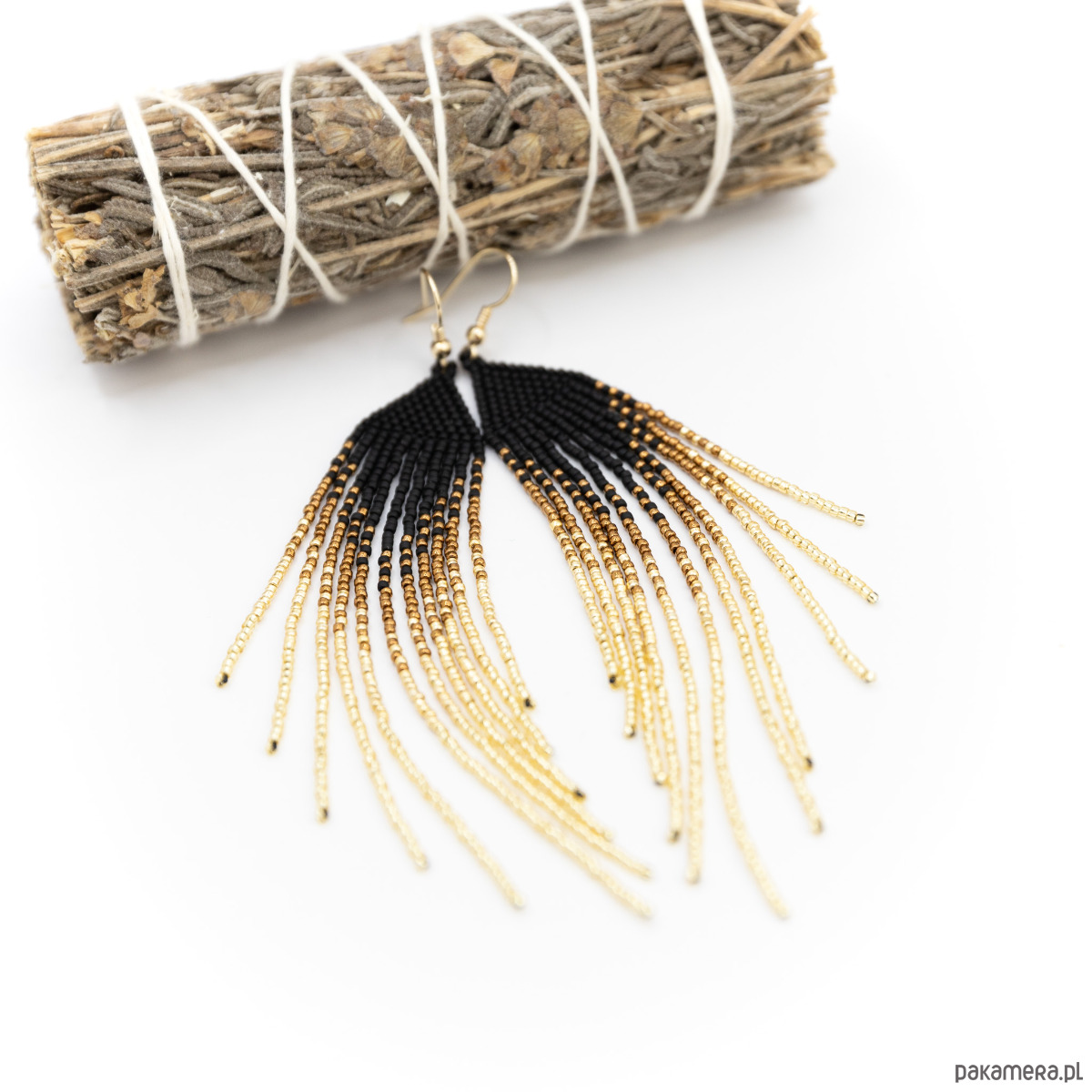 Wykonane z japońskich szklanych koralików. Wymiary kolczyka: 12cm/2cm. Bigle ze stali szlachetnej, pozłacane.