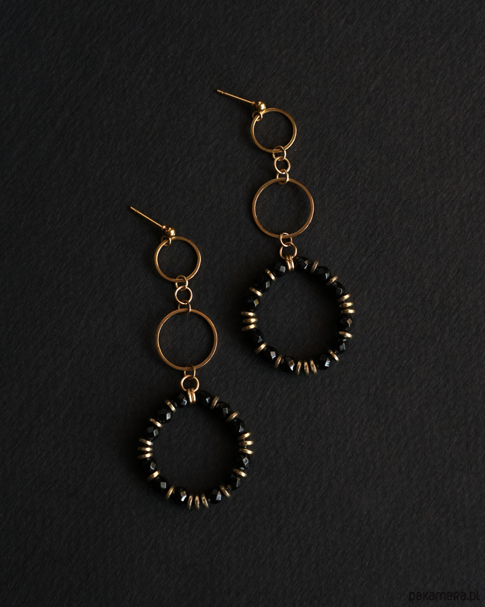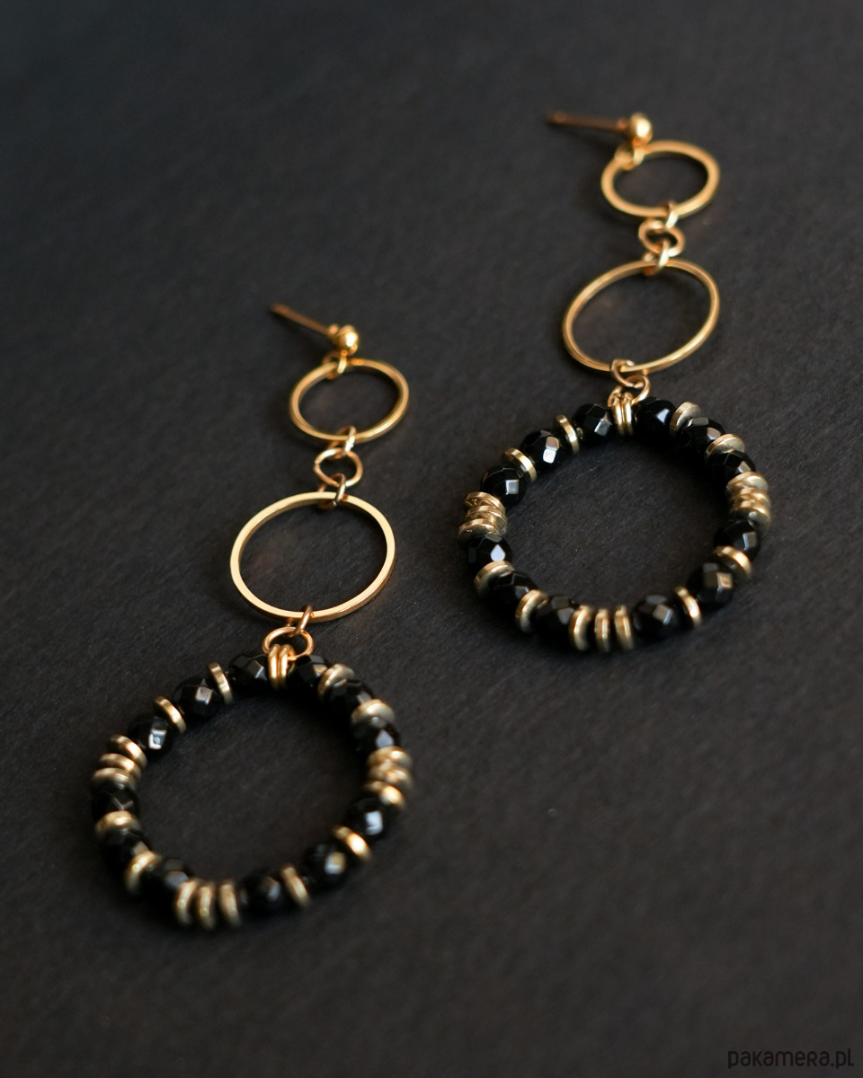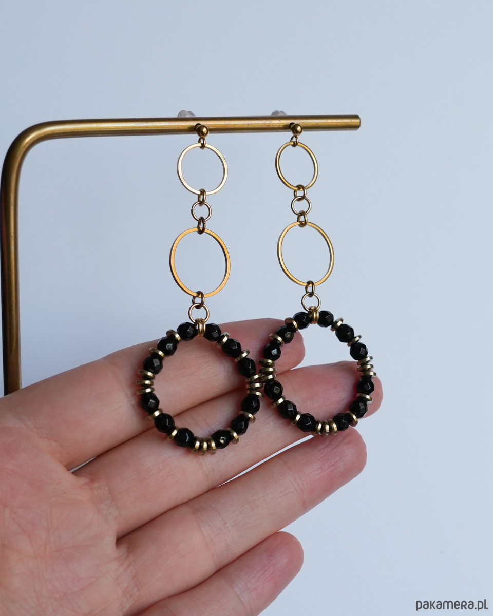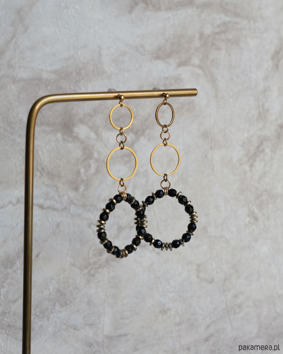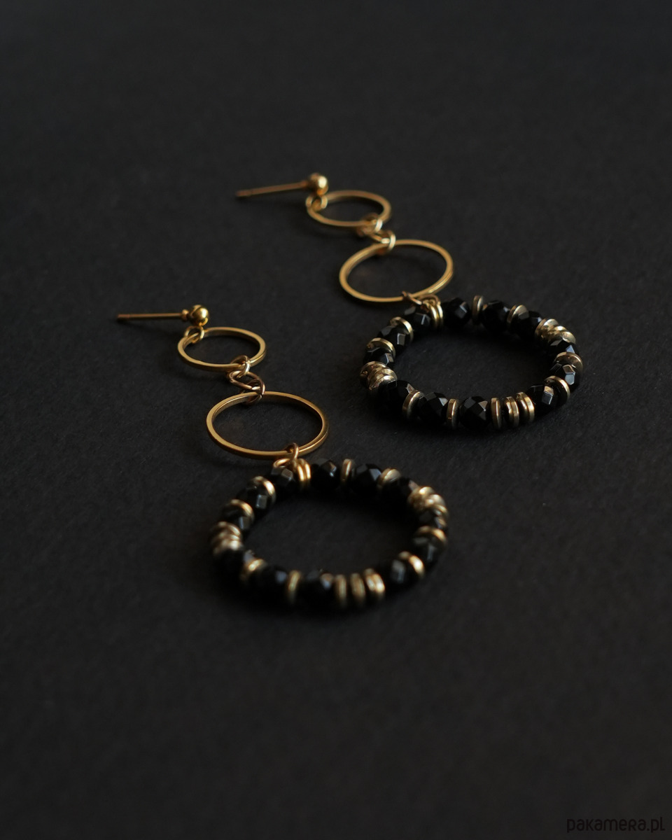 Materiały: czarny kamień syntetyczny black stone, złoty hematyt, stal szlachetna.