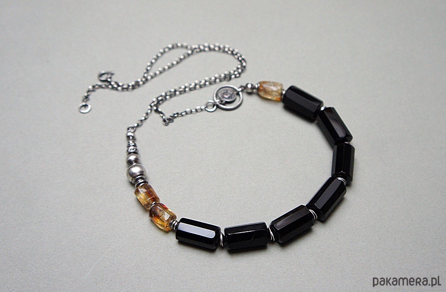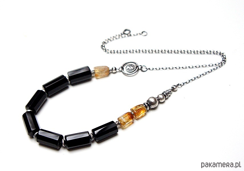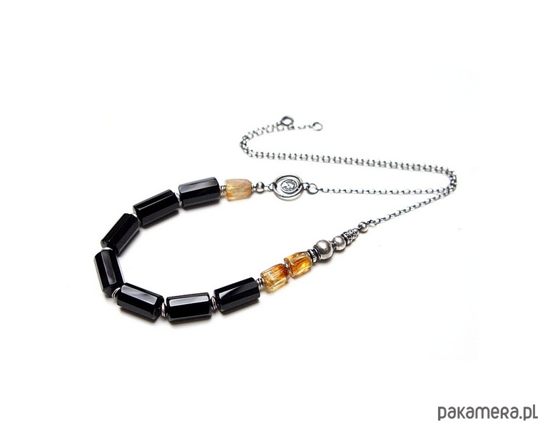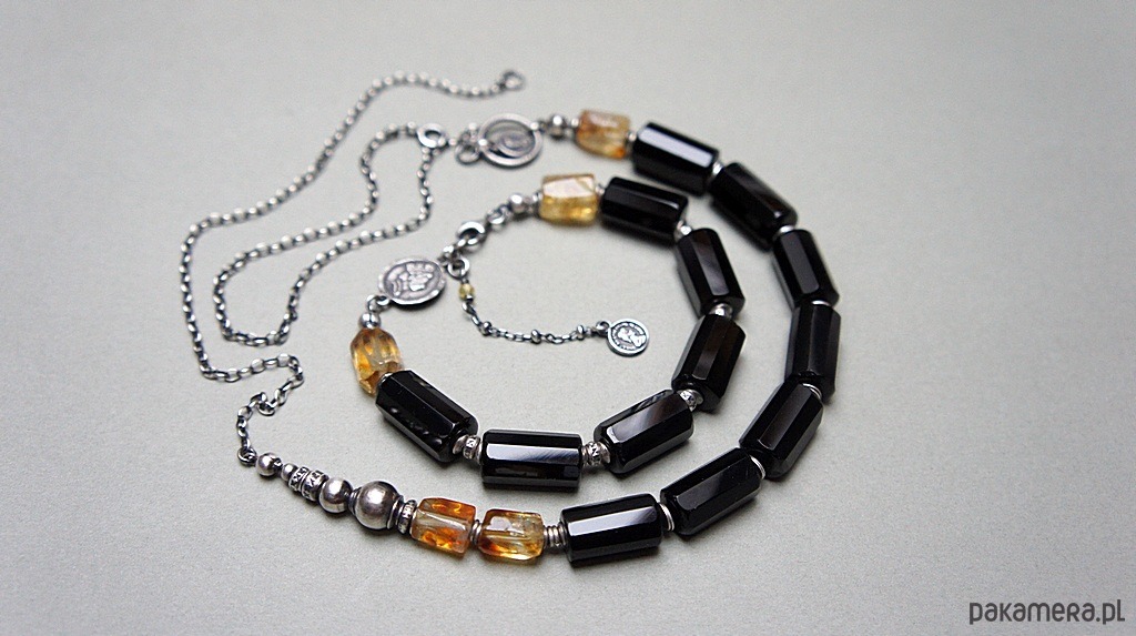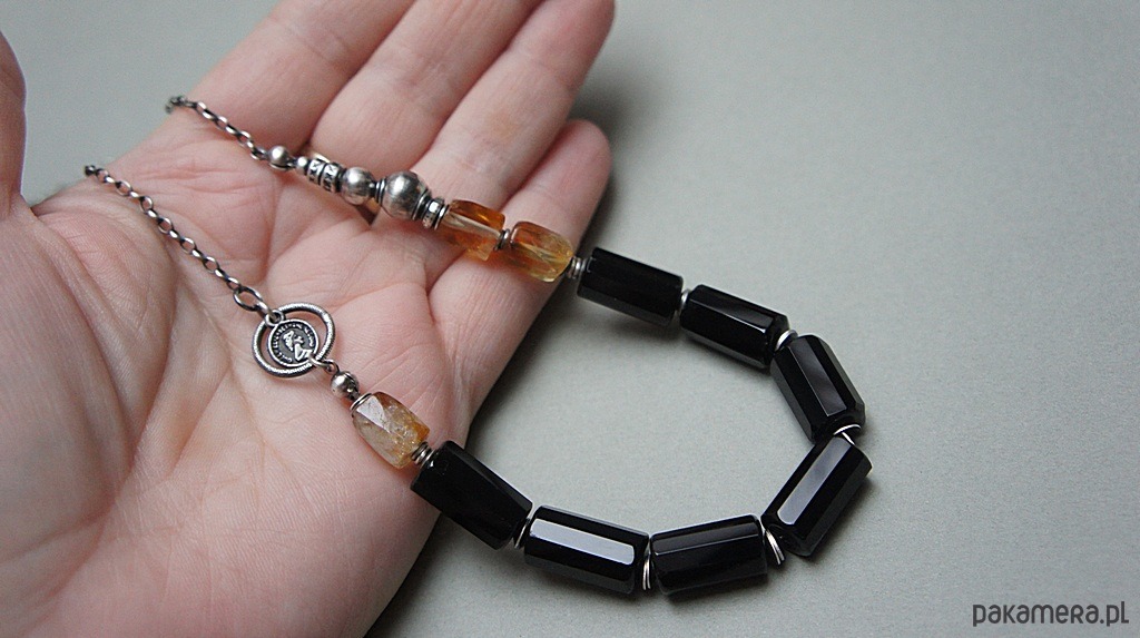 Naszyjnik wykonany ze srebra [pr. 925] w połączeniu z fasetowanymi walcami onyksów [16mm ], bryłkami cytrynów [12mm] -kamienie posiadają naturalne niedoskonałości oraz srebrną imitacją monety . Całość oksydowana i przetarta. Całkowita długość naszyjnika około 60cm . Biżuteria ozdobnie zapakowana.