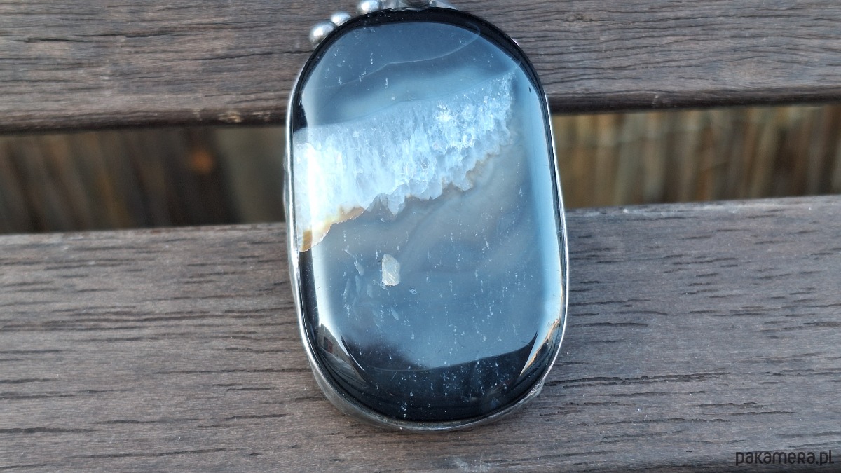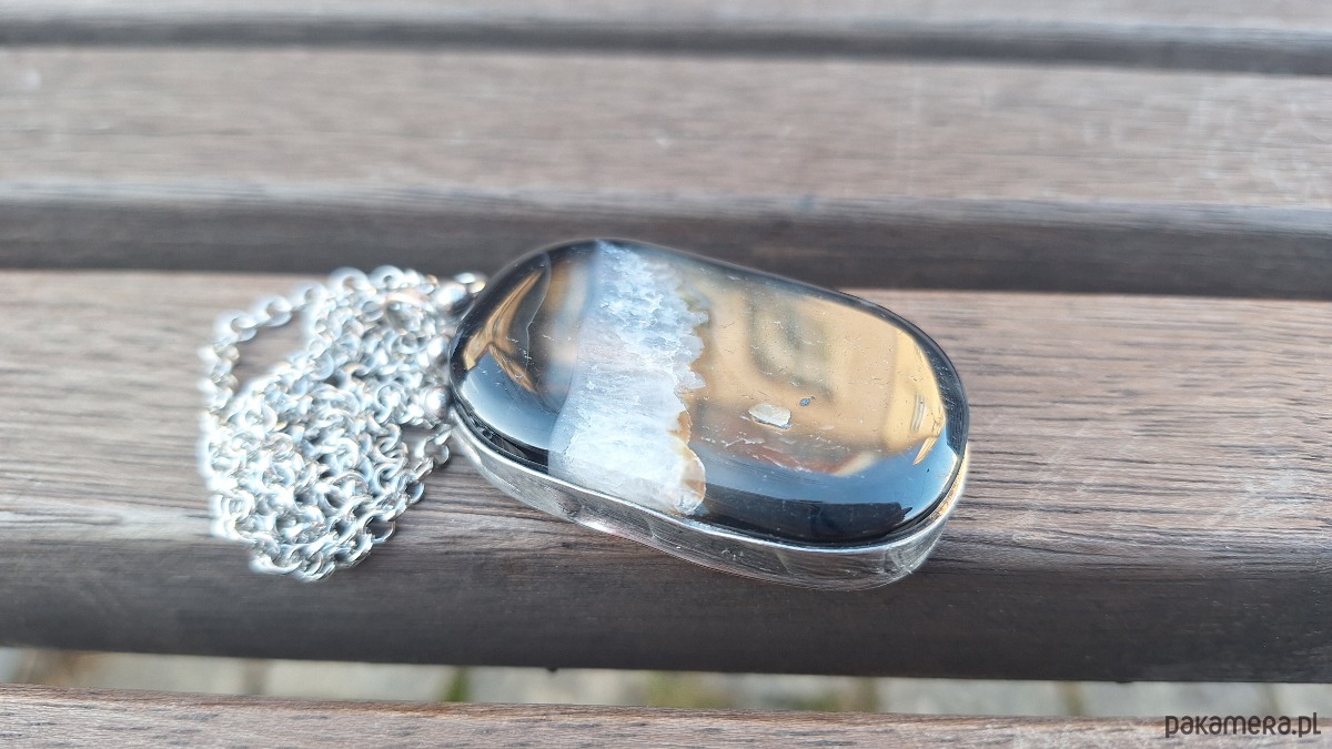 Wisiorek wykonany z miedzi, cyny i agatu. Wymiary ok. 5.5 na 3.5 cm. Zawieszony na łańcuszku o długości ok. 50 cm.