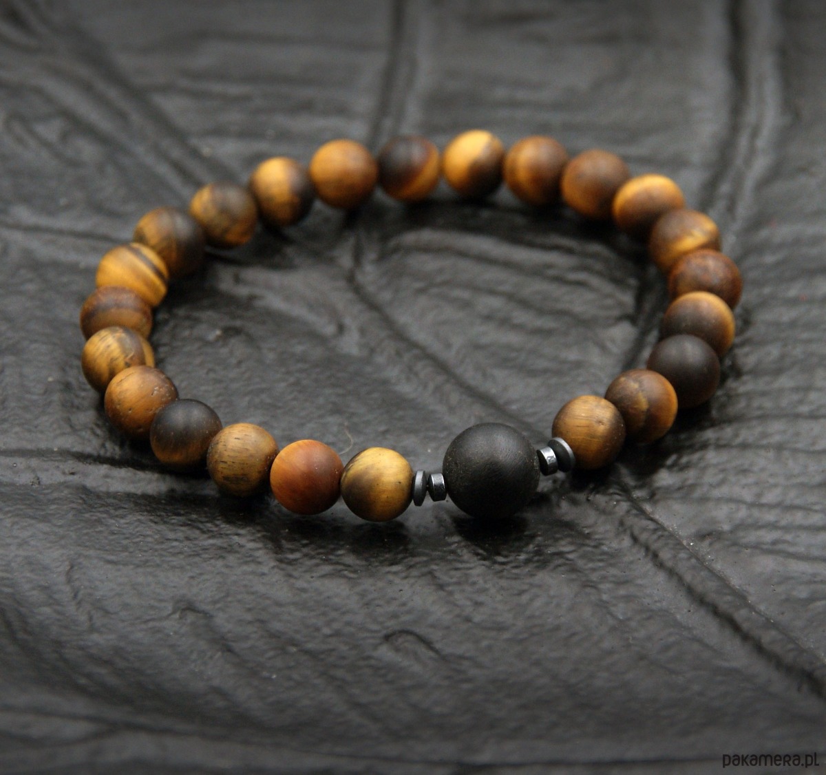 wykonana z kuli czarnego bursztynu 10mm (kolor realny: bardzo ciemny brąz) , matowe kule tygrysiego oka (8mm)
