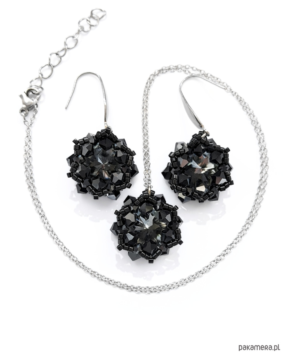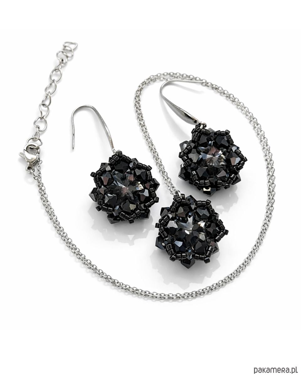 Zarówno naszyjnik, jak i kolczyki zostały wykonane z najwyższej jakości kryształów Preciosa Rivoli Maxima w kolorze Night Fall – hipnotyzującym odcieniu grafitu z metalicznymi refleksami srebra, który pięknie odbija światło i nadaje biżuterii eleganckiego charakteru.