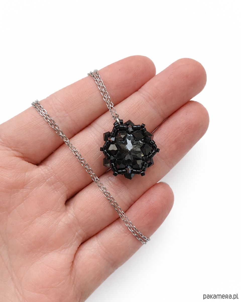 Całość uzupełniają wysokiej jakości koraliki Miyuki Delica w klasycznej czerni, które podkreślają głębię kompozycji i nadają jej wyrafinowanego wykończenia.