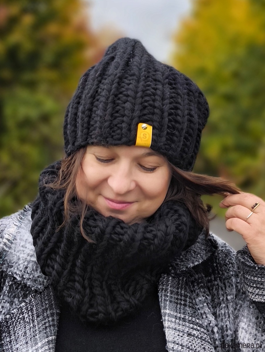 Czarny komplet zimowy: 100% wełna czapka wełniana i komin