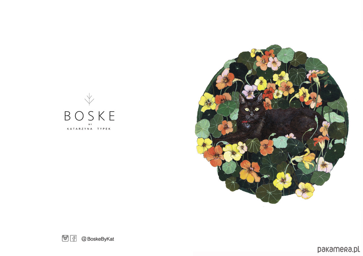 Czarny kot w nasturcjach, wydruk autorskiej ilustracji inspirowanej światem rodzimej fauny oraz estetyką vintage.