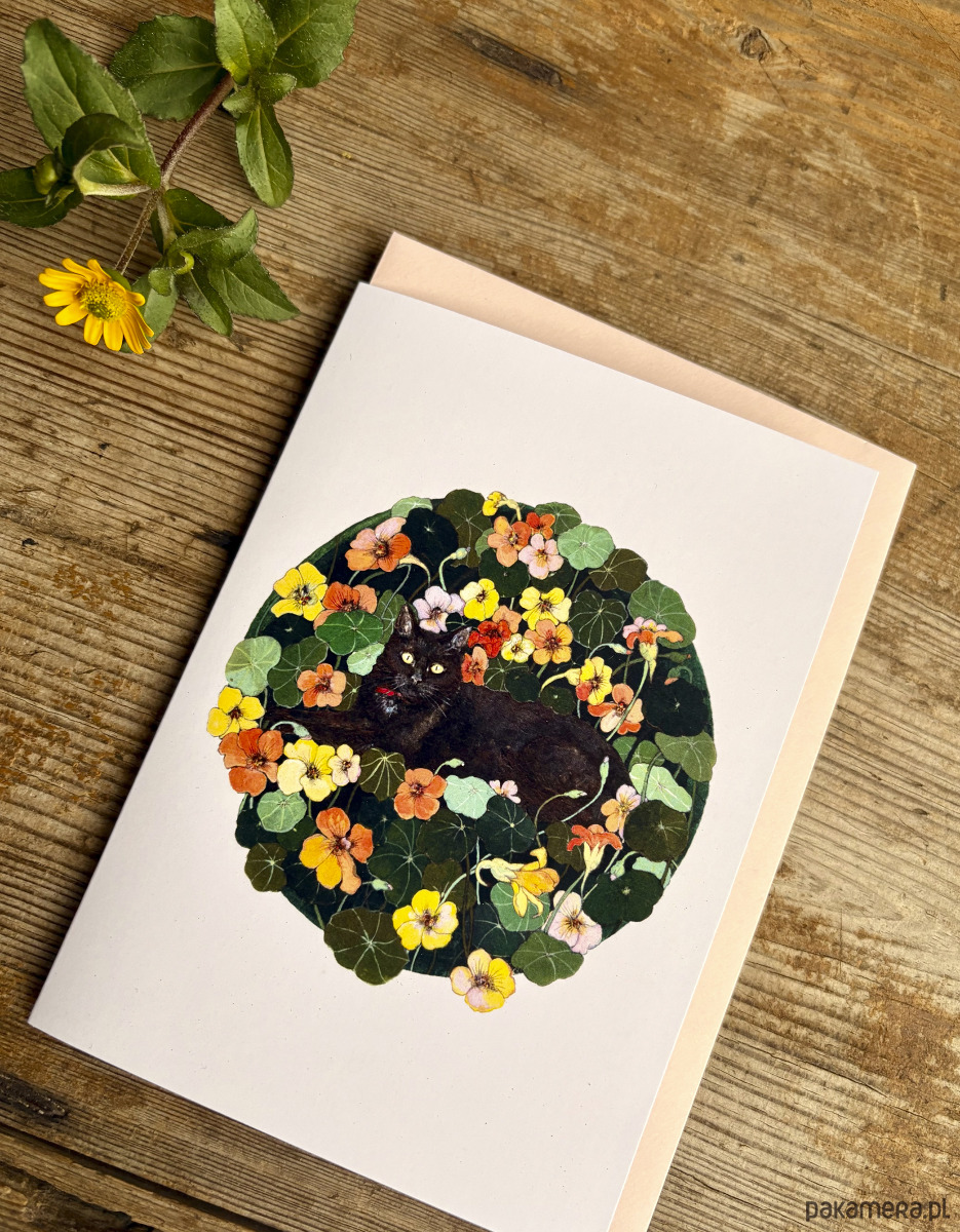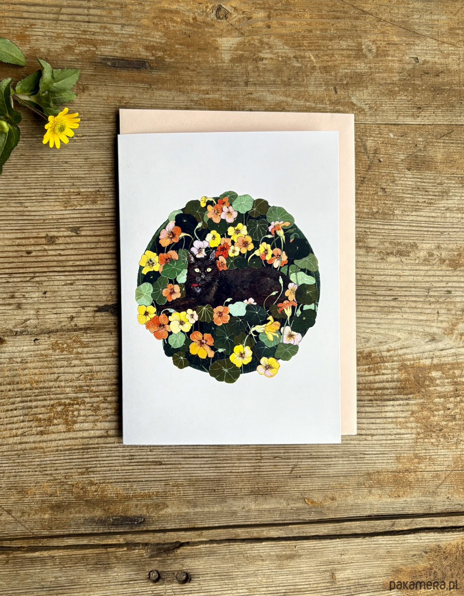 Czarny kot w nasturcjach- Kartka- Grafika- Ilustracja- Zwierzaki