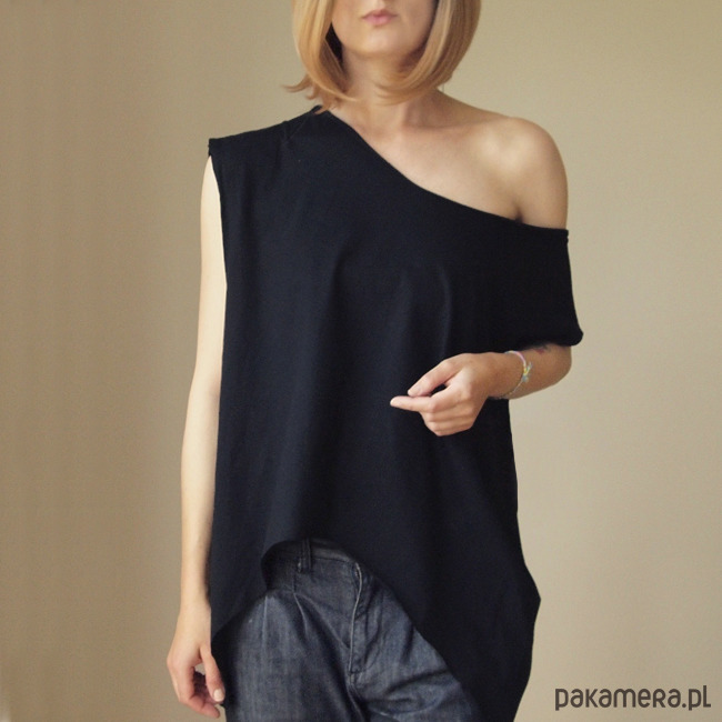 Ogromna koszulka bez rękawów, wszystkie krawędzie cięte, surowe, bez szycia: podwijają się i naciągają. Z przodu półokrągłe wycięcie, tył prosty.