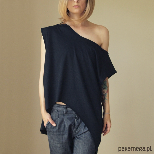 Ogromna koszulka bez rękawów, wszystkie krawędzie cięte, surowe, bez szycia: podwijają się i naciągają. Z przodu półokrągłe wycięcie, tył prosty.