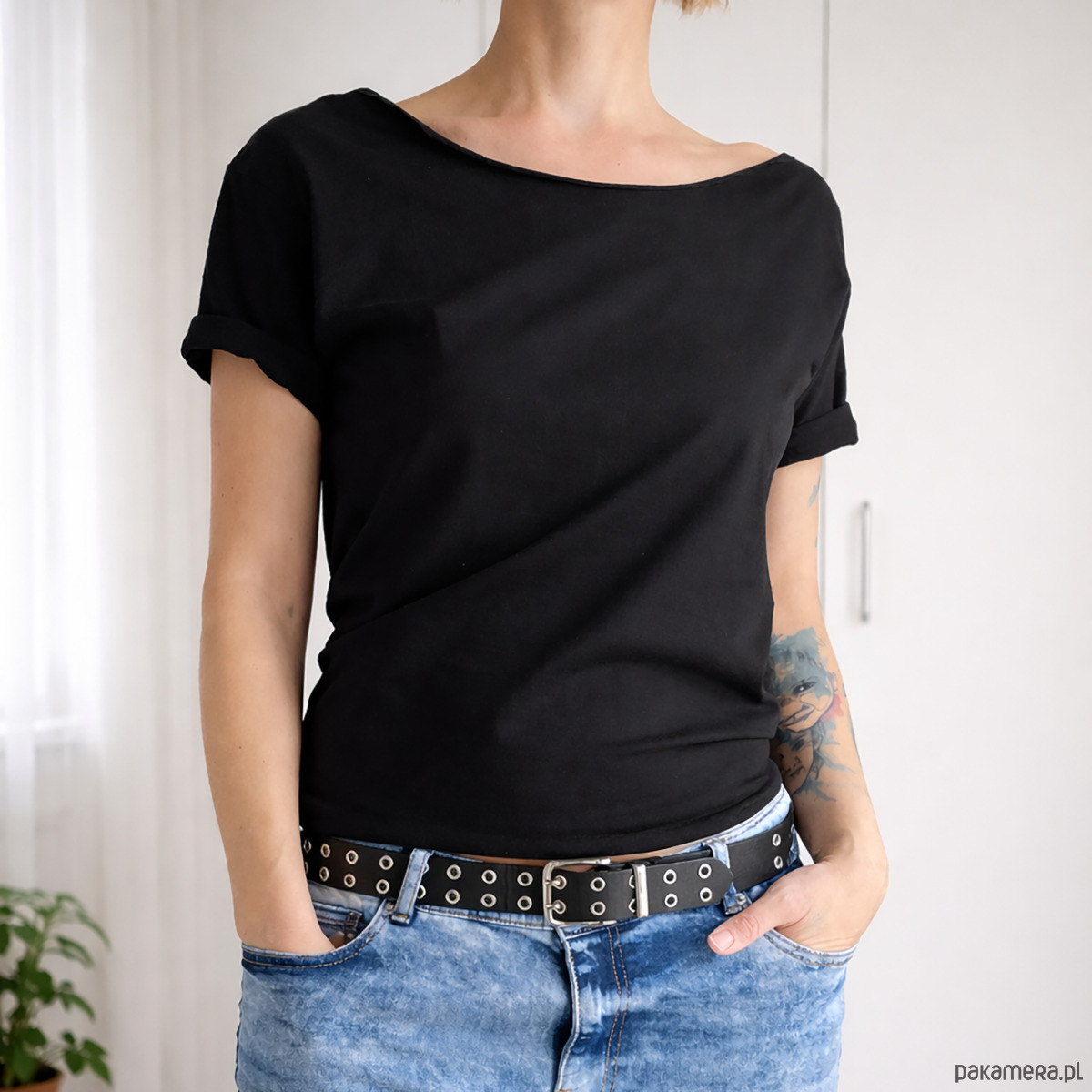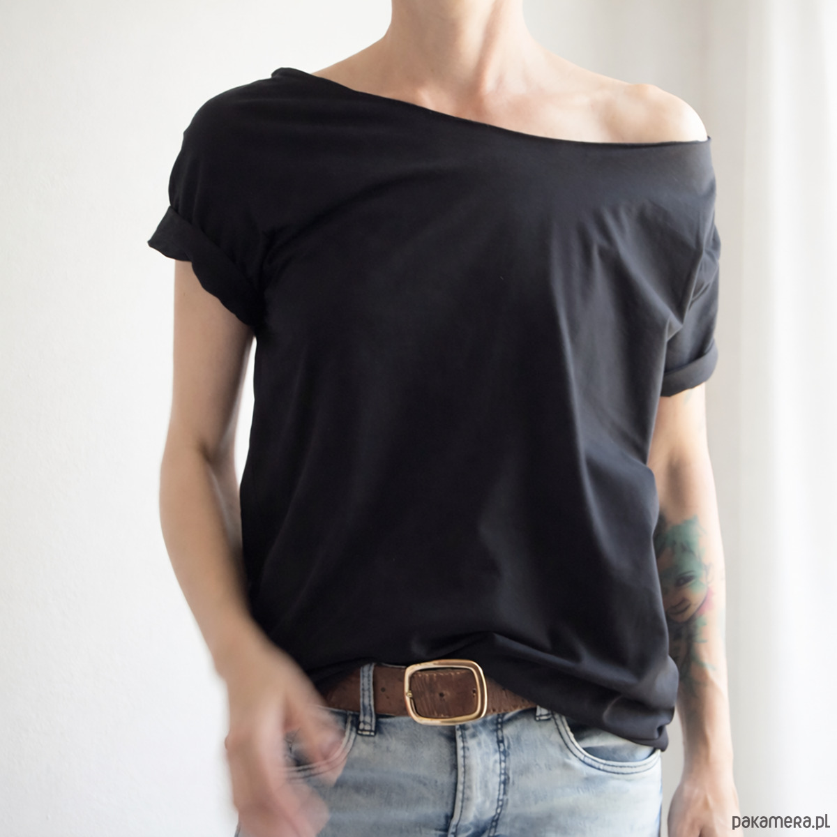 Czarna koszulka z ciętym dekoltem. Opadający dekolt, zsuwa się z ramienia.