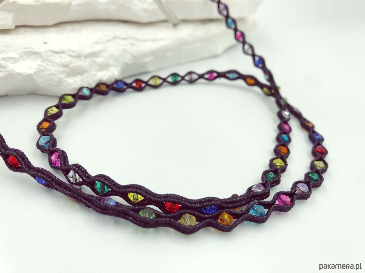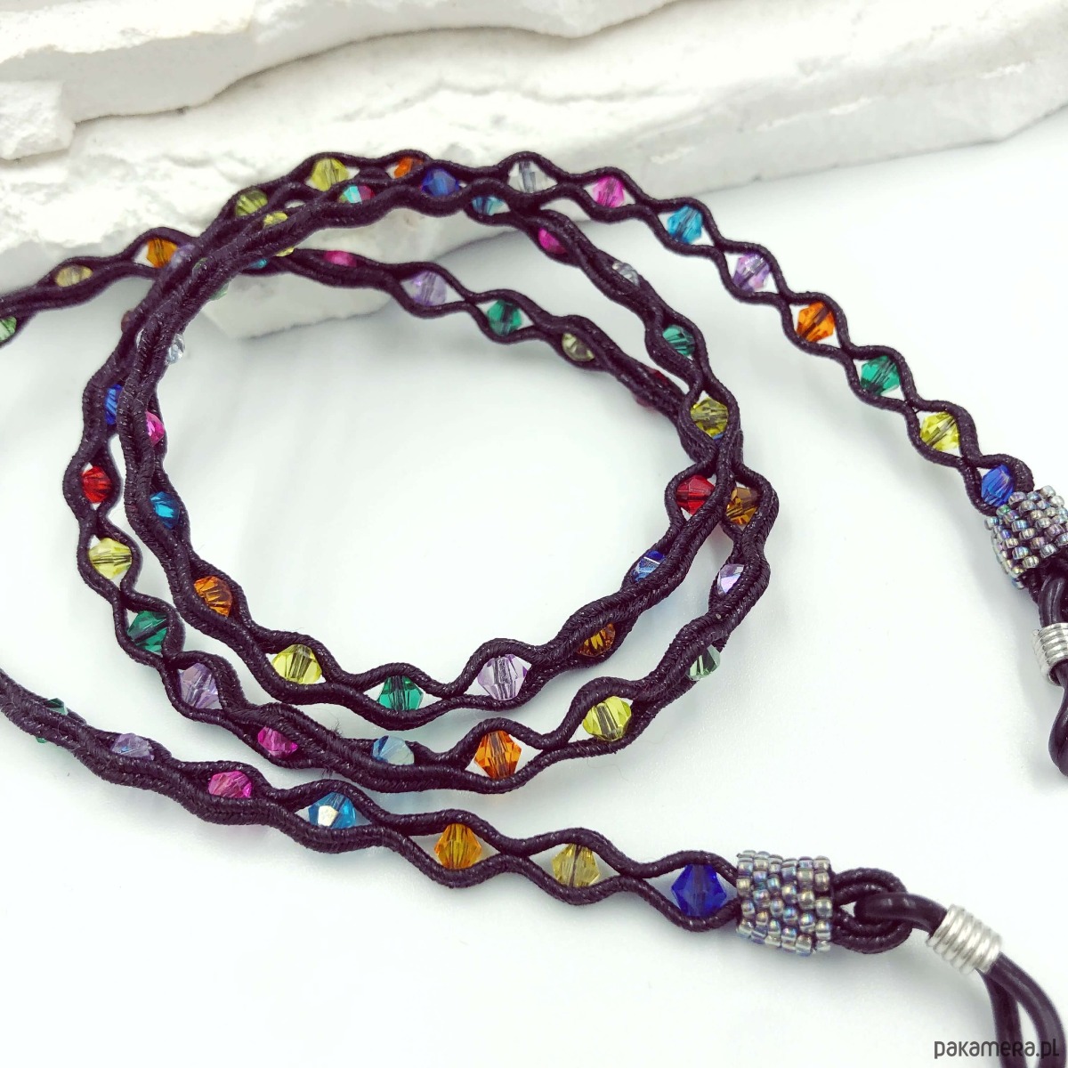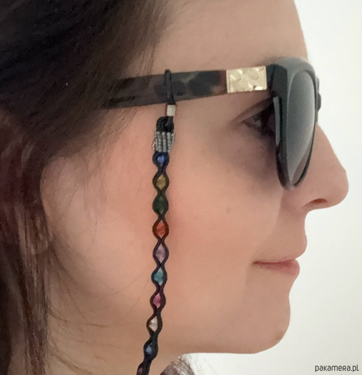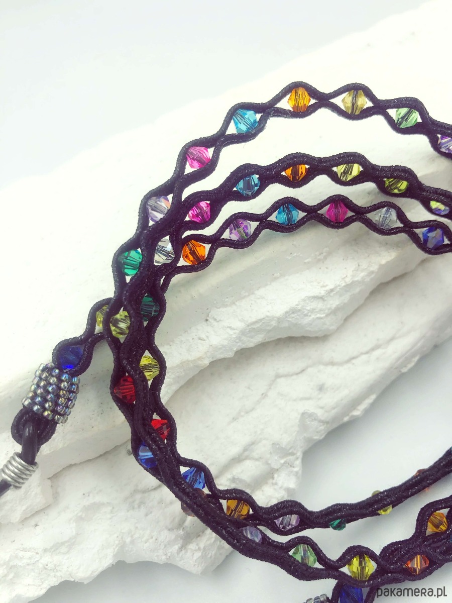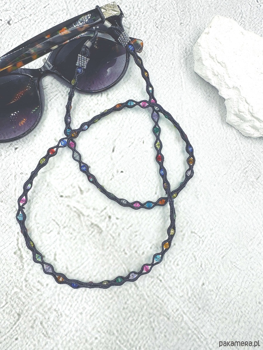 Stylowy czarny pasek do okularów, uszyty ręcznie i zdobiony kolorowymi koralikami. Dzięki eleganckiemu kontrastowi pasuje zarówno do casualowych, jak i bardziej eleganckich stylizacji. To praktyczne i modne rozwiązanie – okulary zawsze będą pod ręką, a pasek doda im charakteru. Świetnie sprawdzi się jako dodatek wakacyjny lub prezent dla osób ceniących unikatowe rękodzieło.