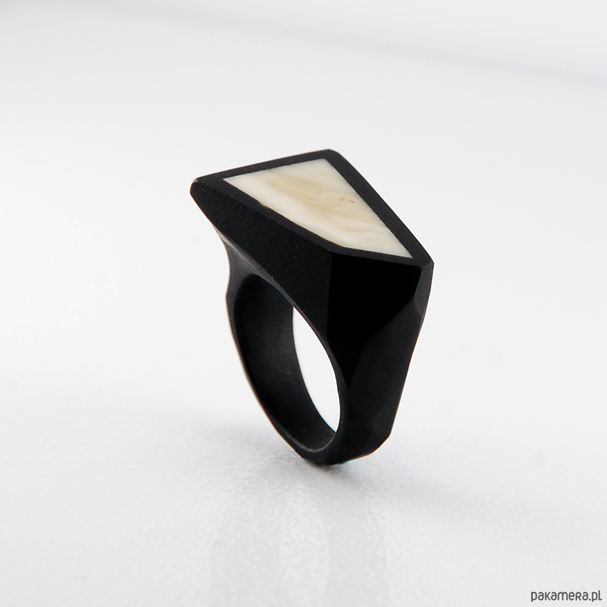 Czarny pierścionek FRAME z mlecznym bursztynem