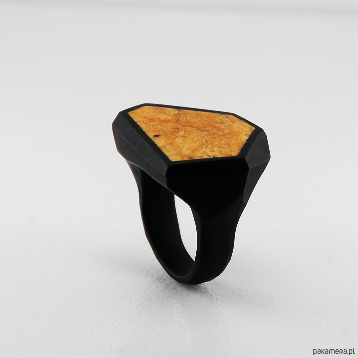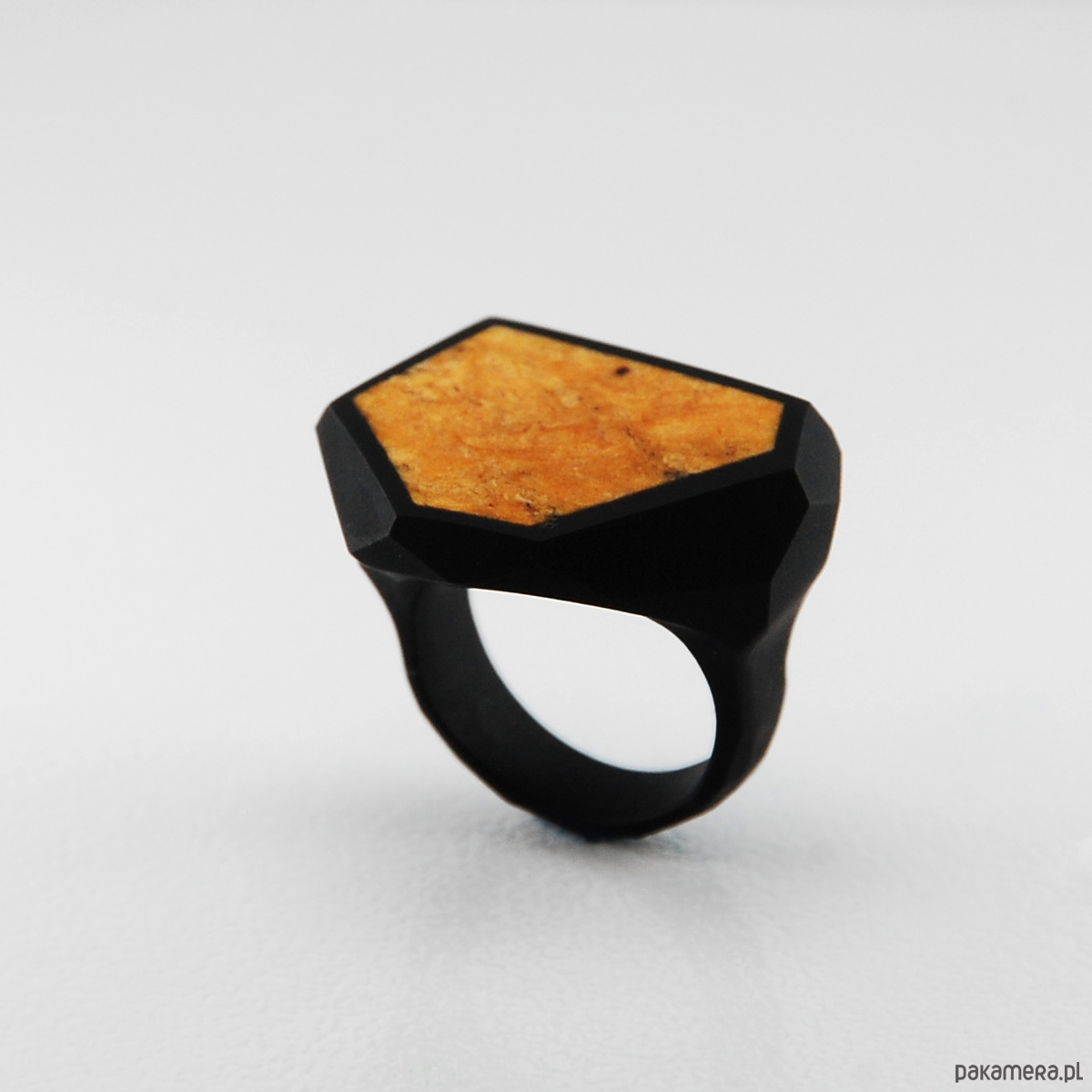 Czarny pierścionek FRAME z pomarańczowym bursztynem