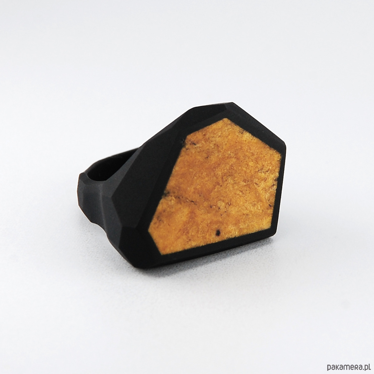 Duży pierścionek z bursztynem bałtyckim. Naturalny pomarańcowy bursztyn został oprawiony w matowej czarnej żywicy. Wymiary bursztynu 18x26mm, rozmiar 17.