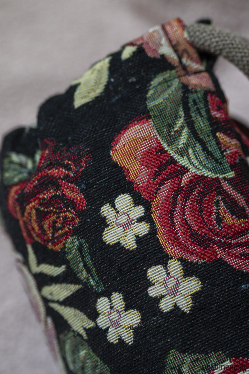 Plecak worek wykonany z żakardu w kwiaty. Jego kształt sprawia, iż idealnie nadaje się na pokrowiec na matę do jogi.