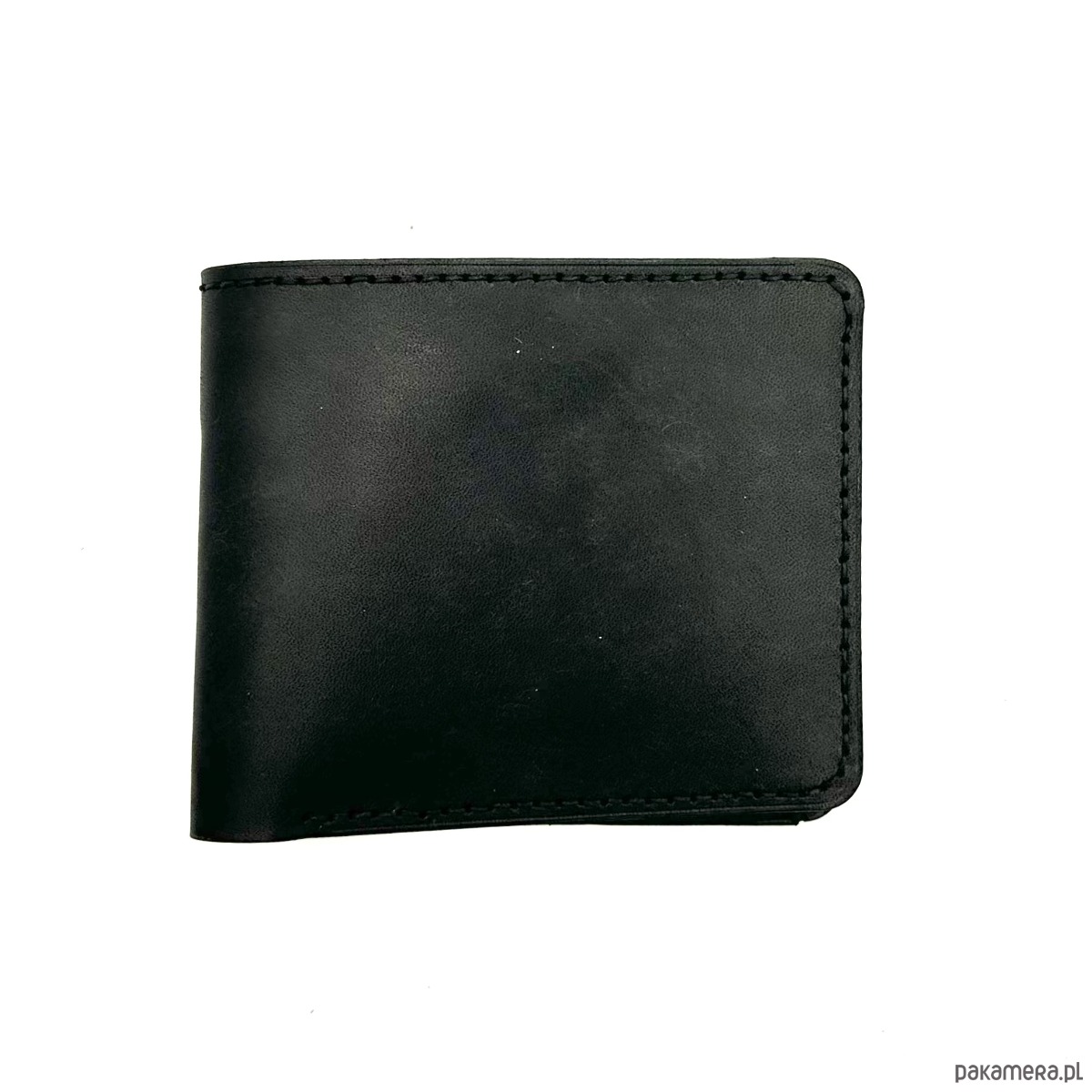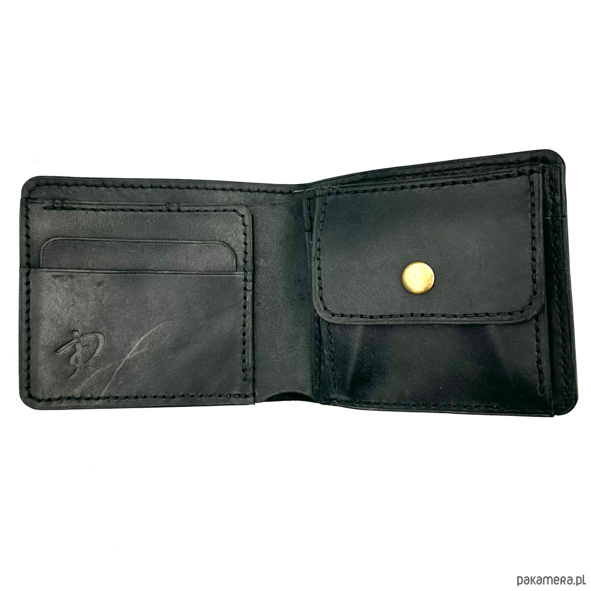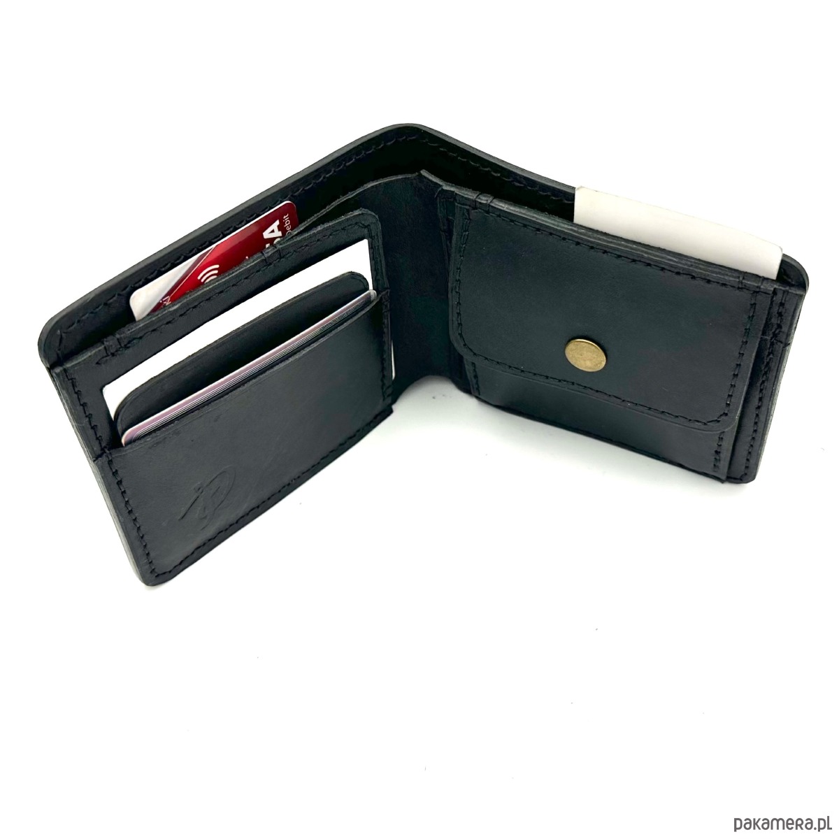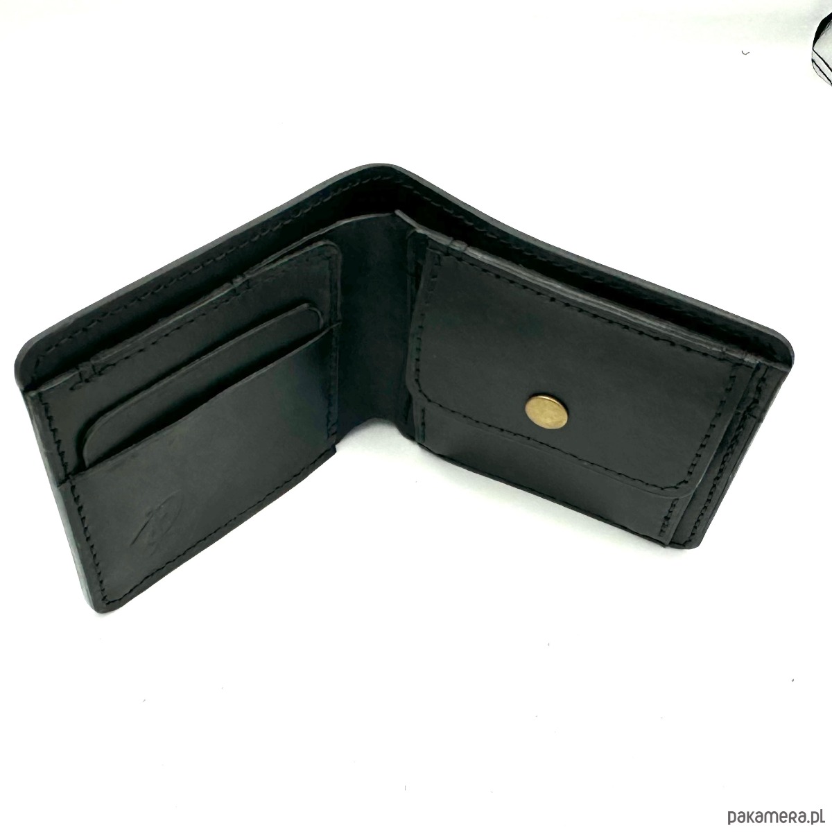Czarny portfel skórzany na bilon ręcznie uszyty.
