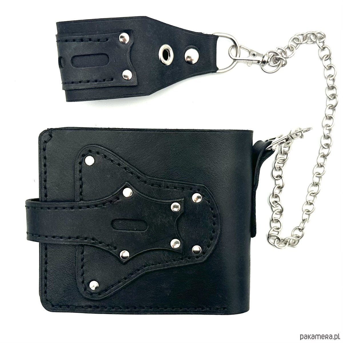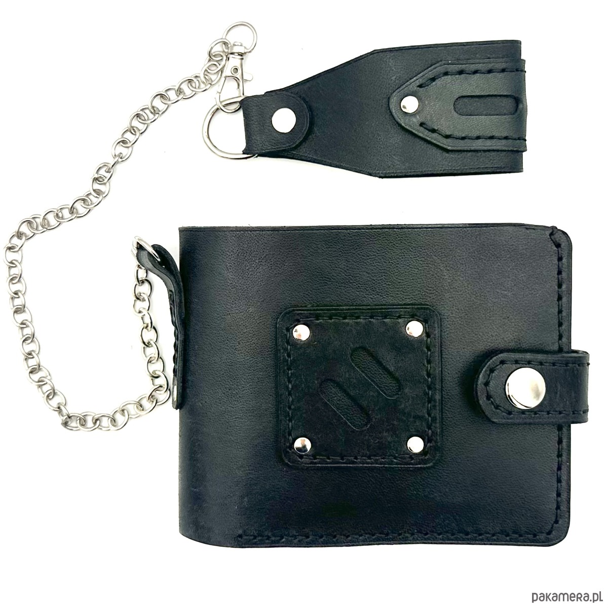 Całość dopełnia skórzana szlufka na pasek połączona ze srebrnym, odpinanym łańcuszkiem 🔗, która nadaje portfelowi wyrazisty, lekko motocyklowy charakter 🏍️.
