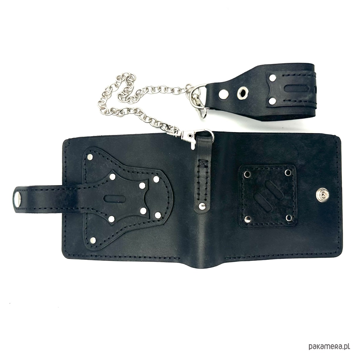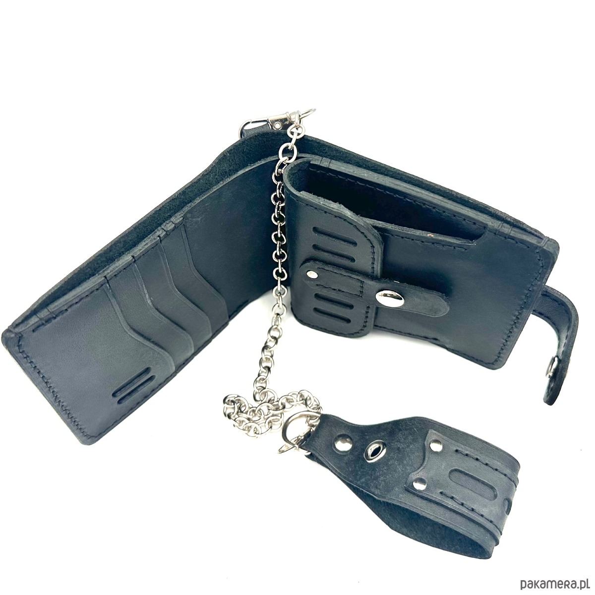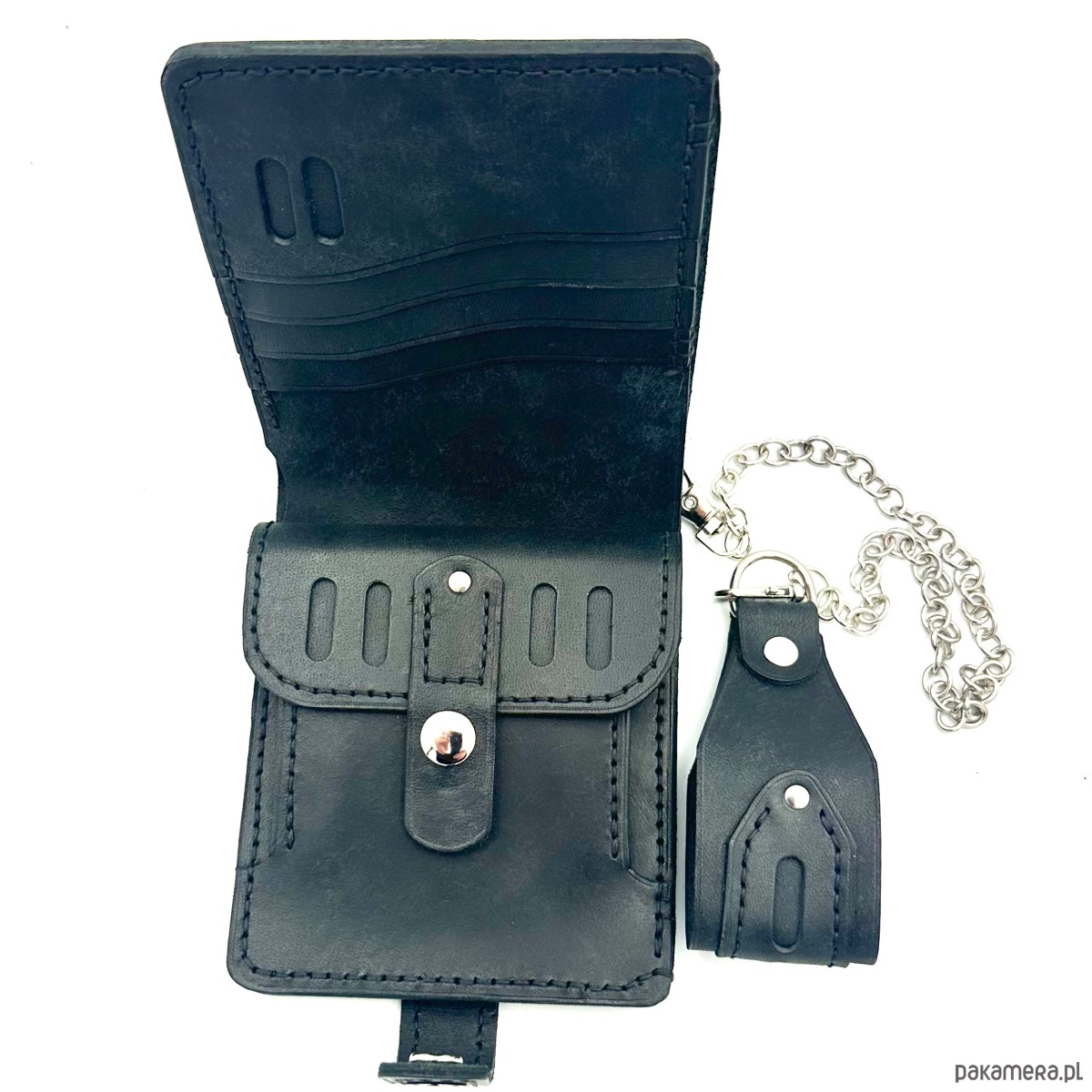 Czarny portfel skórzany na bilon ręcznie uszyty z łańcuszkiem do paska.