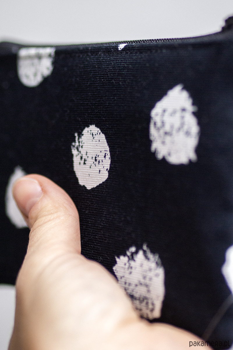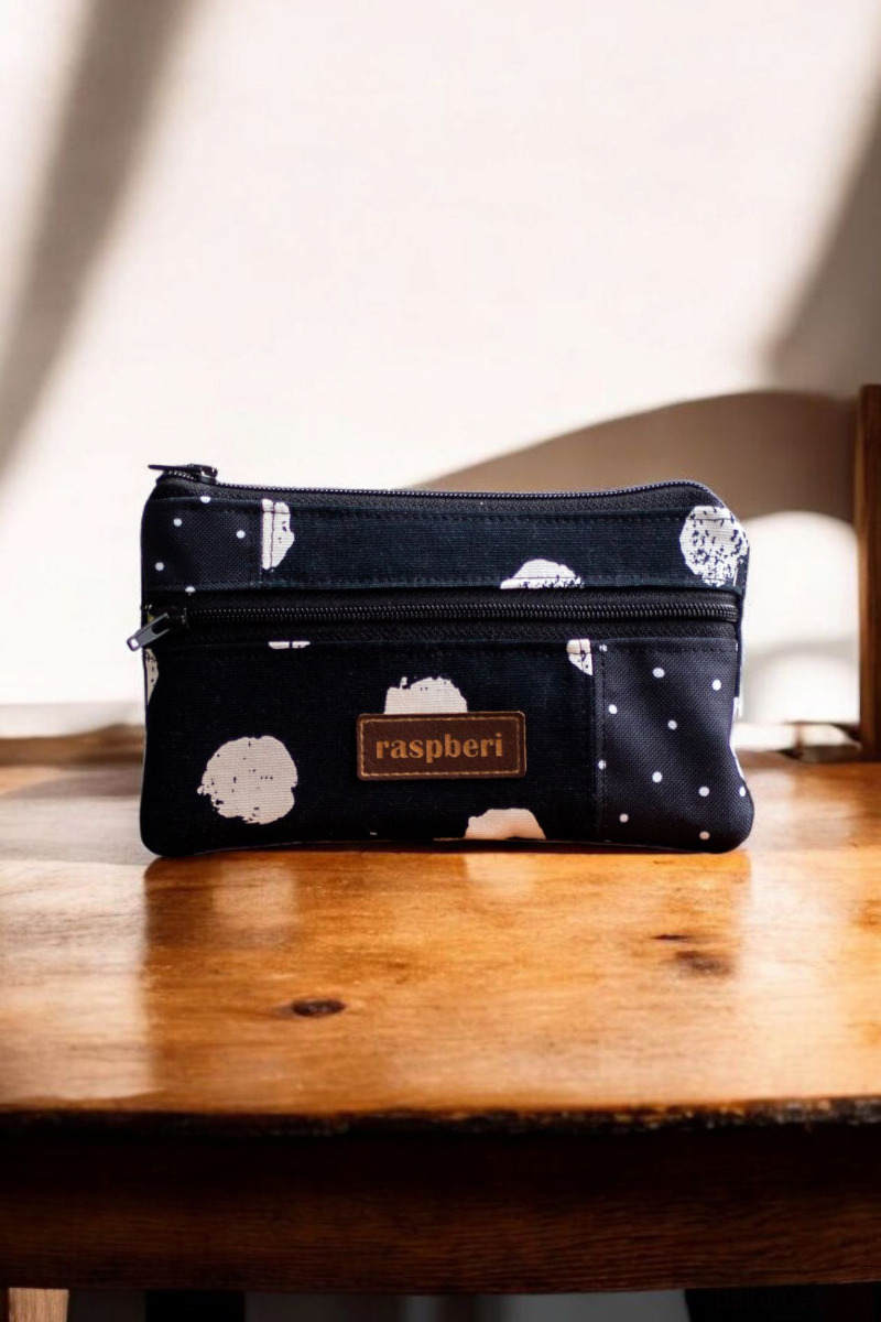Prosty wodoodporny portfel wykonany z czarnej tkaniny w białe plamki.