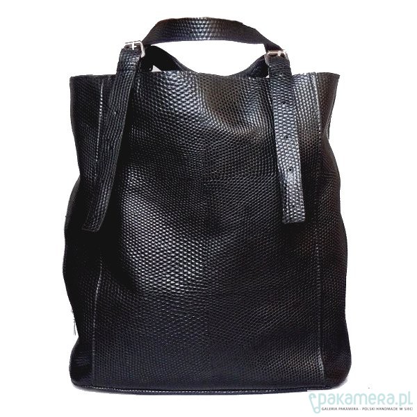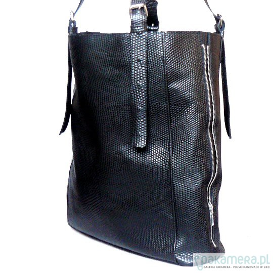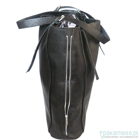 Skóra lekko nabłyszczana, raczej sztywna. Z boku dekoracyjne metalowe zamki. Zapinana na zamek, w środku czarna podszewka, wewnątrz 2 kieszonki skórzane i 1 na zamek.