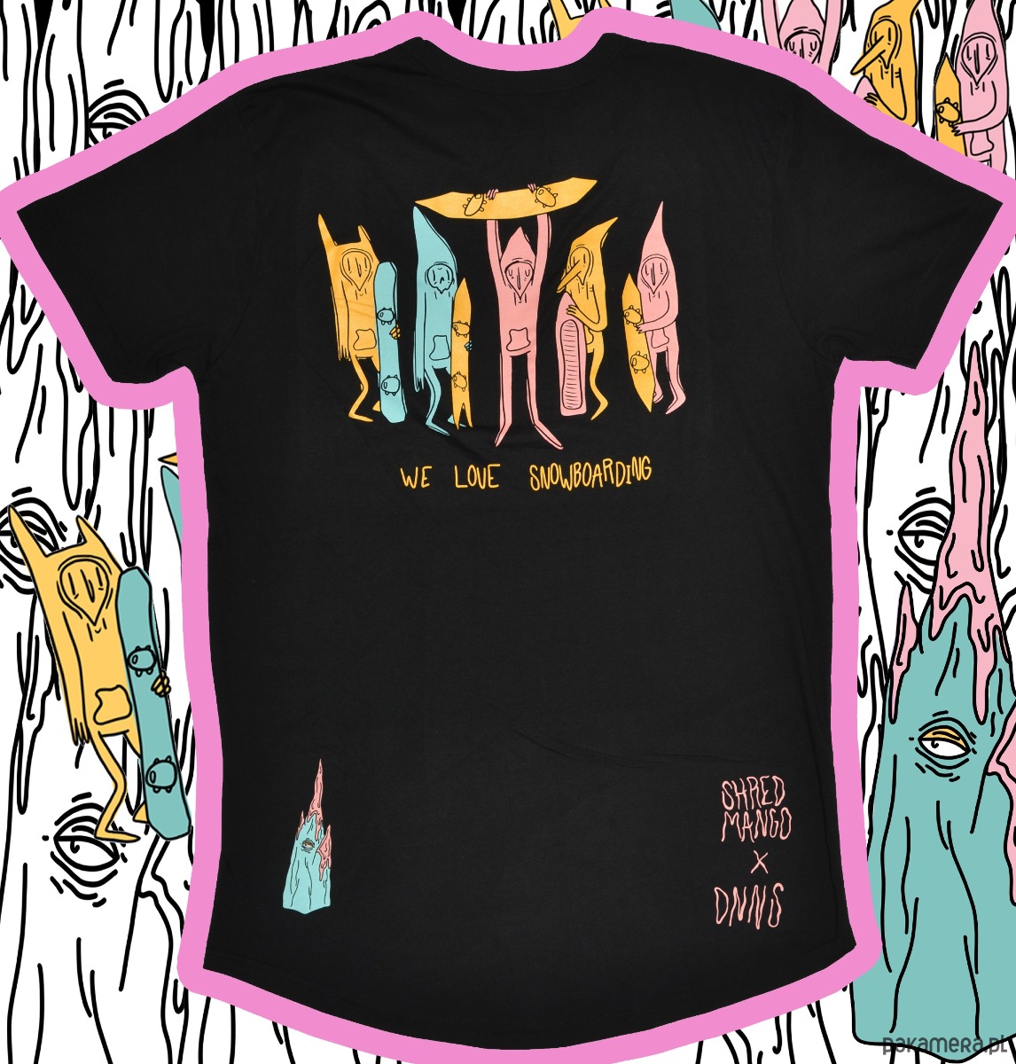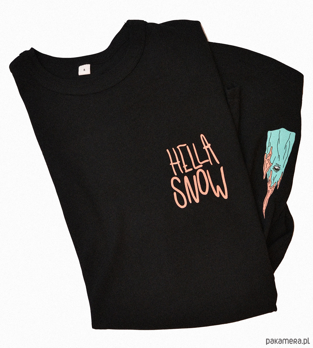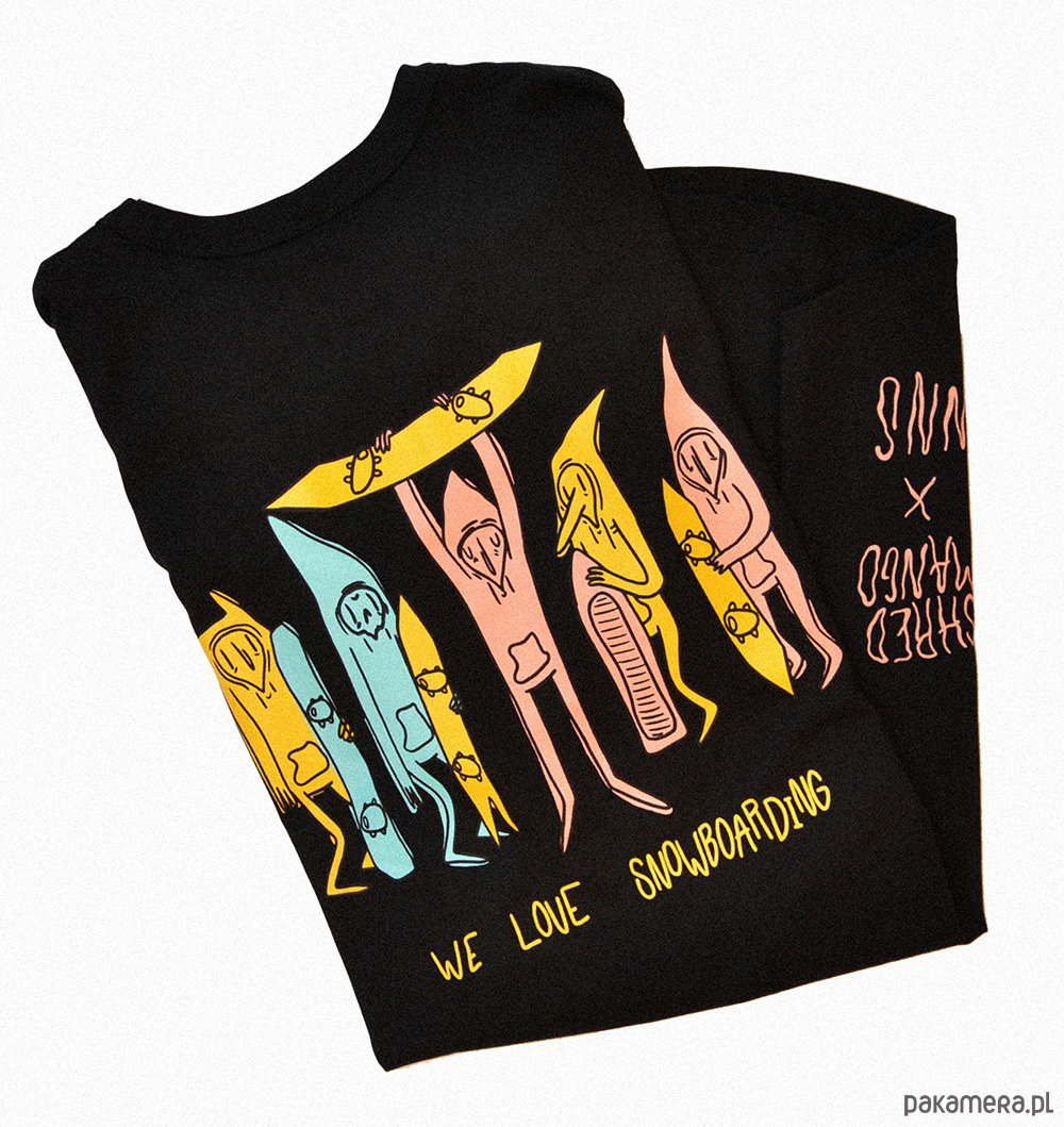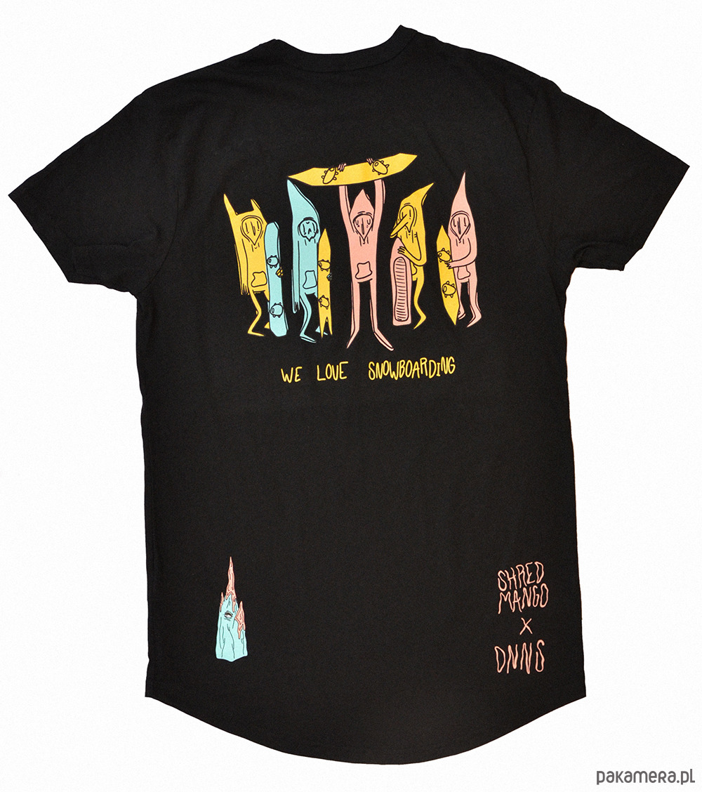 Design. Sitodruk HELLA SNOW na froncie i większą ekipą na plecach. Napis WE LOVE SNOWBOARDING i SHRED MANGO x DNNS dla czytelników.