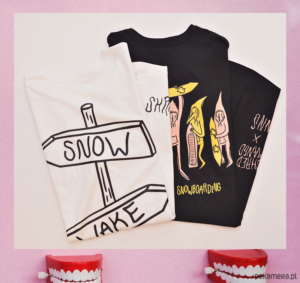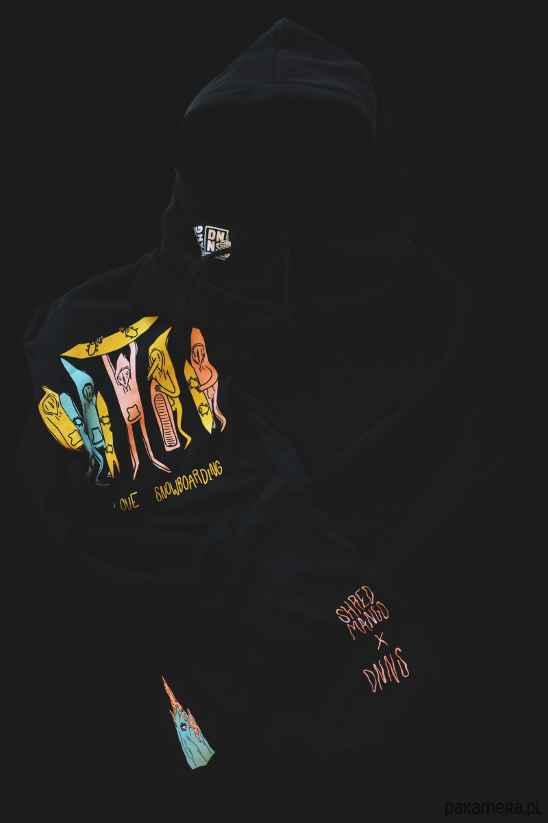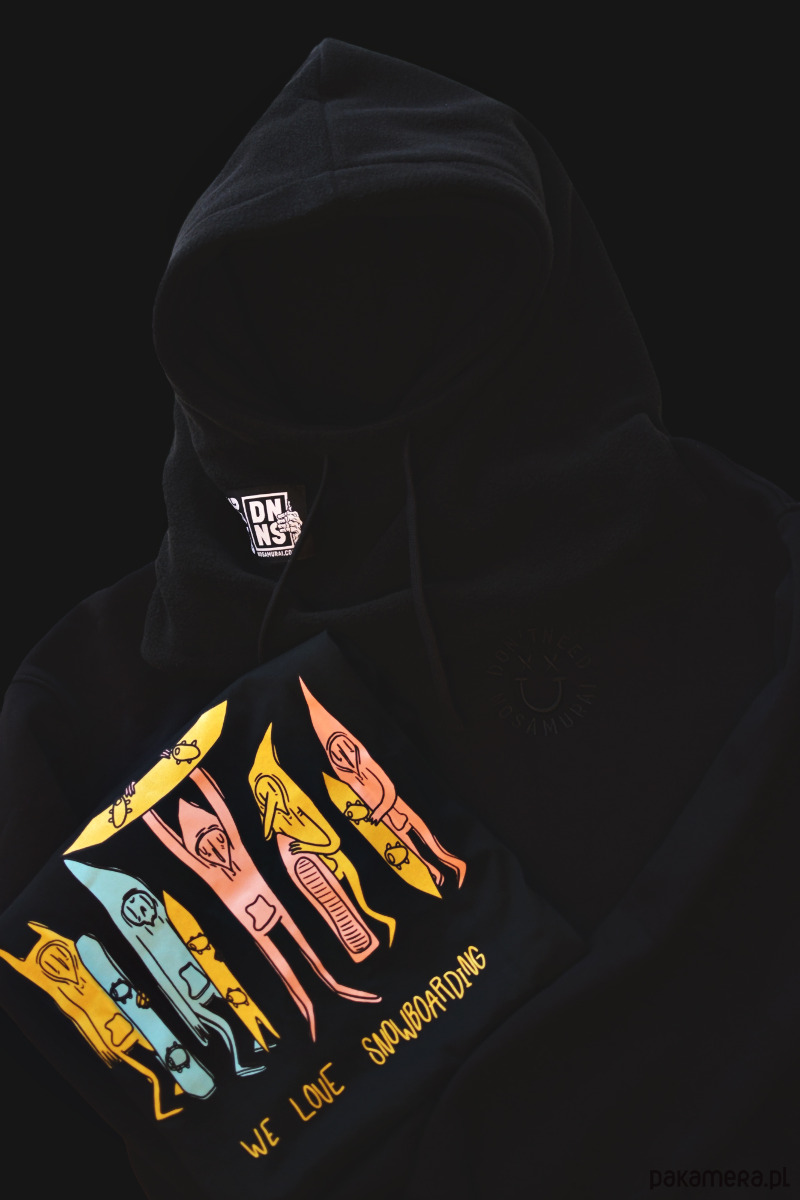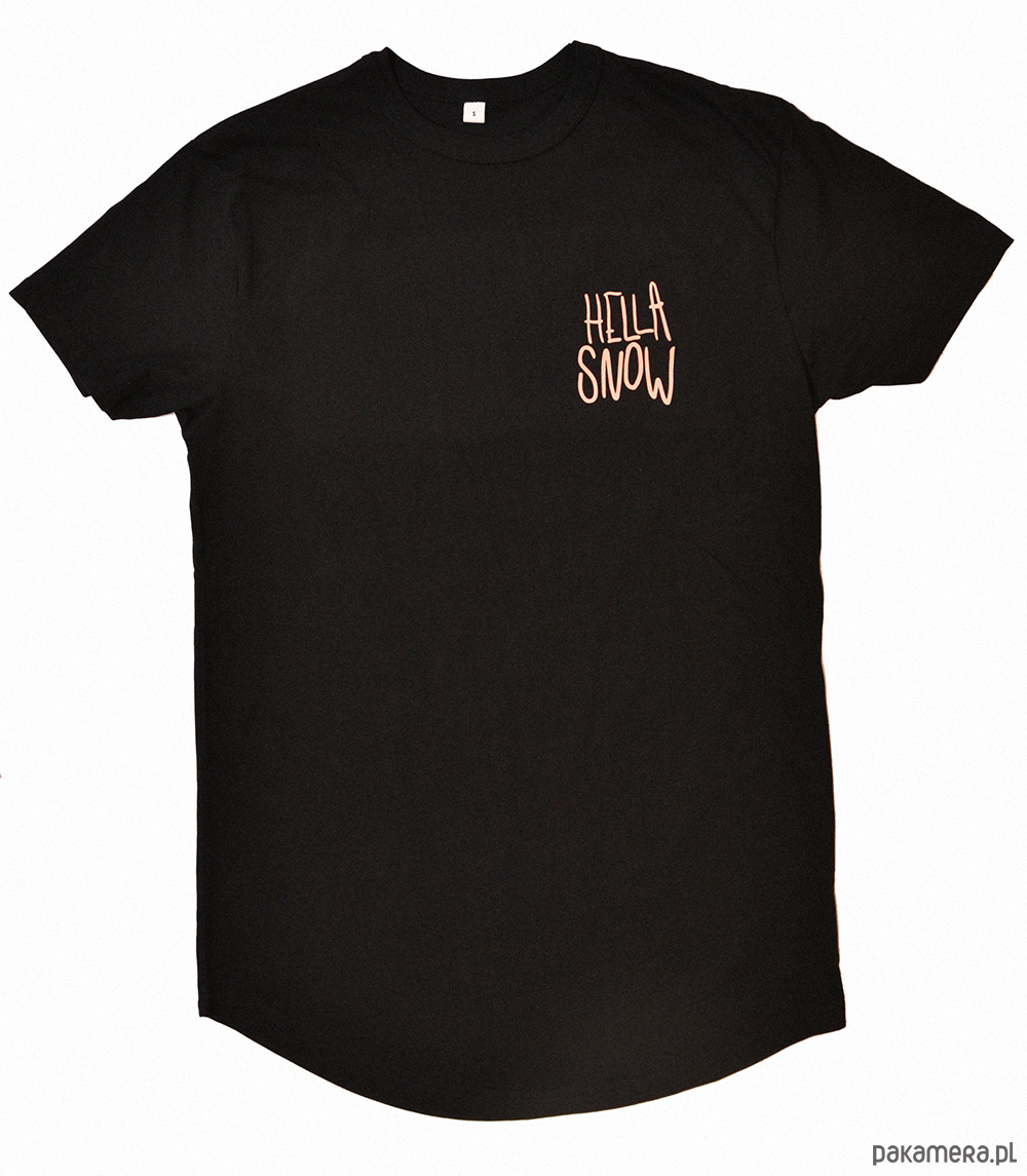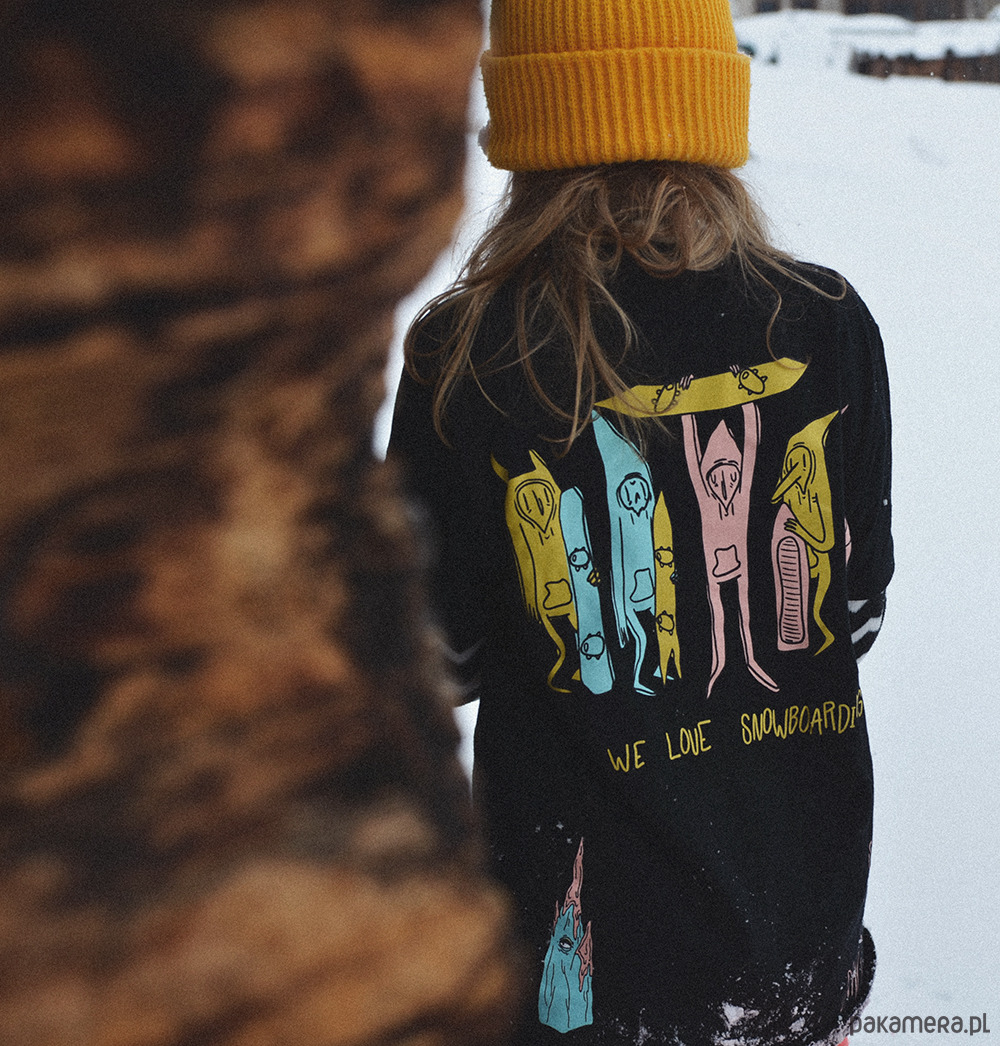 Design. Sitodruk HELLA SNOW na froncie i większą ekipą na plecach. Napis WE LOVE SNOWBOARDING i SHRED MANGO x DNNS dla czytelników.