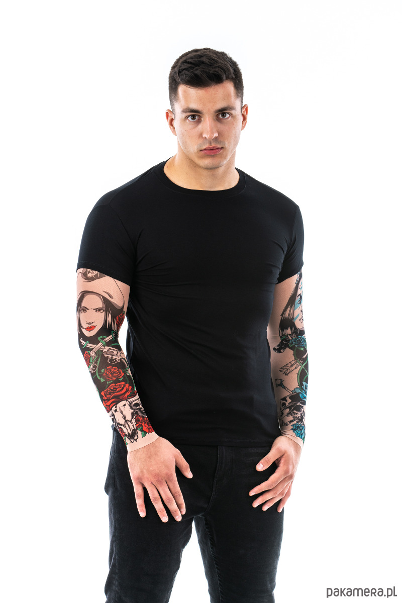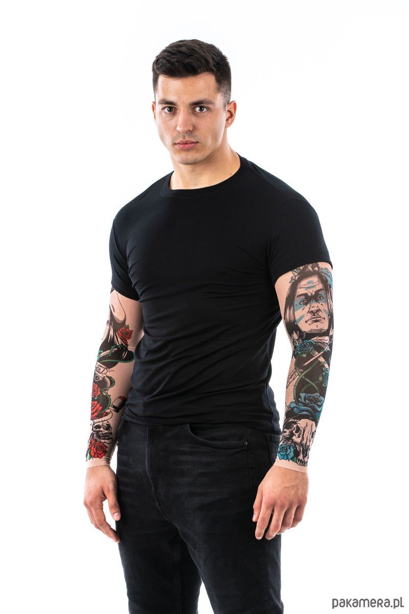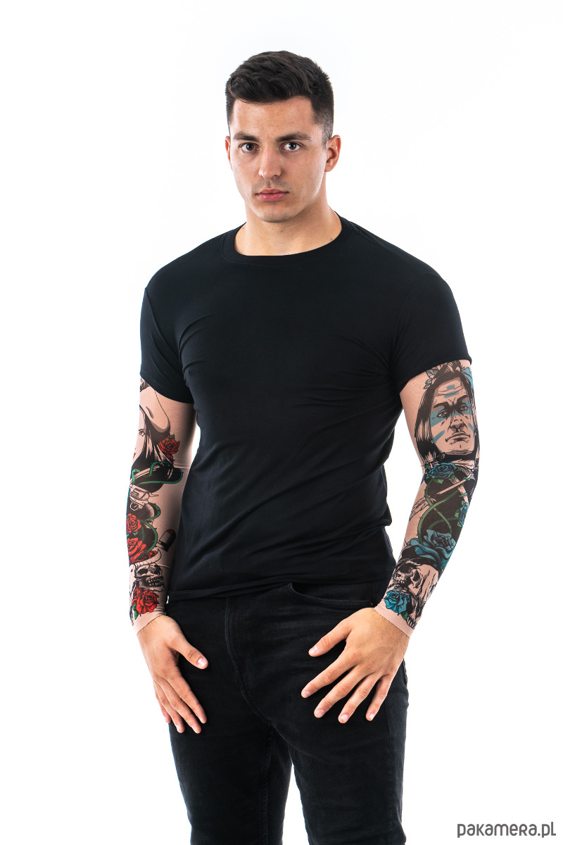 Materiał z którego wykonane są rękawy to przyjemna w dotyku elastyczna siateczka. Jej kolorystyka bardzo dobrze pasuje do koloru skóry, dzięki czemu wykonane na niej nadruki tatuażu wyglądają bardzo realistycznie, nawet z bliskiej odległości. Jest jednocześnie cienka i delikatna oraz mocna i trwała. Materiał z którego wykonana jest koszulka to wysokiej jakości mieszanka wiskozy i elastanu, dzięki czemu t-shirt nie tylko komfortowo się nosi oraz dobrze dopasowuje się do ciała, ale też na długo zachowuje oryginalny wygląd. Nadruk tatuażu na rękawkach został wykonany trwałą metodą i nawet przy dłuższym użytkowaniu oraz po praniu kolory zachowują oryginalny wygląd i intensywność.