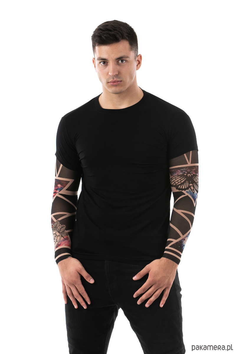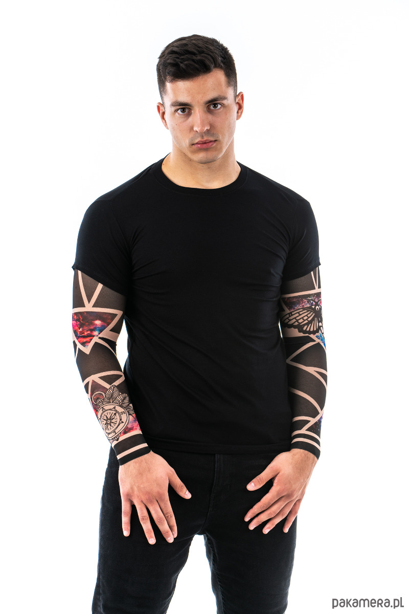 Mega oryginalny t-shirt dla mężczyzn z wszytymi rękawami dającymi złudzenie prawdziwych tatuaży.
