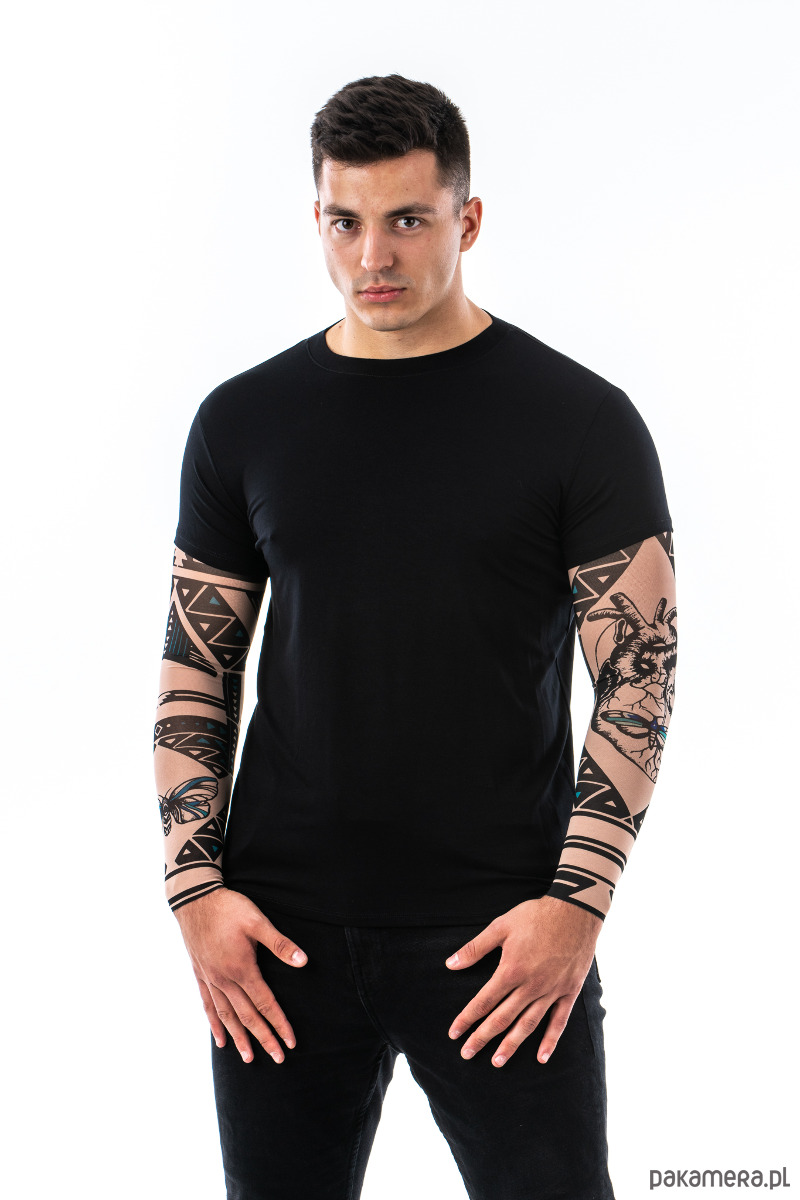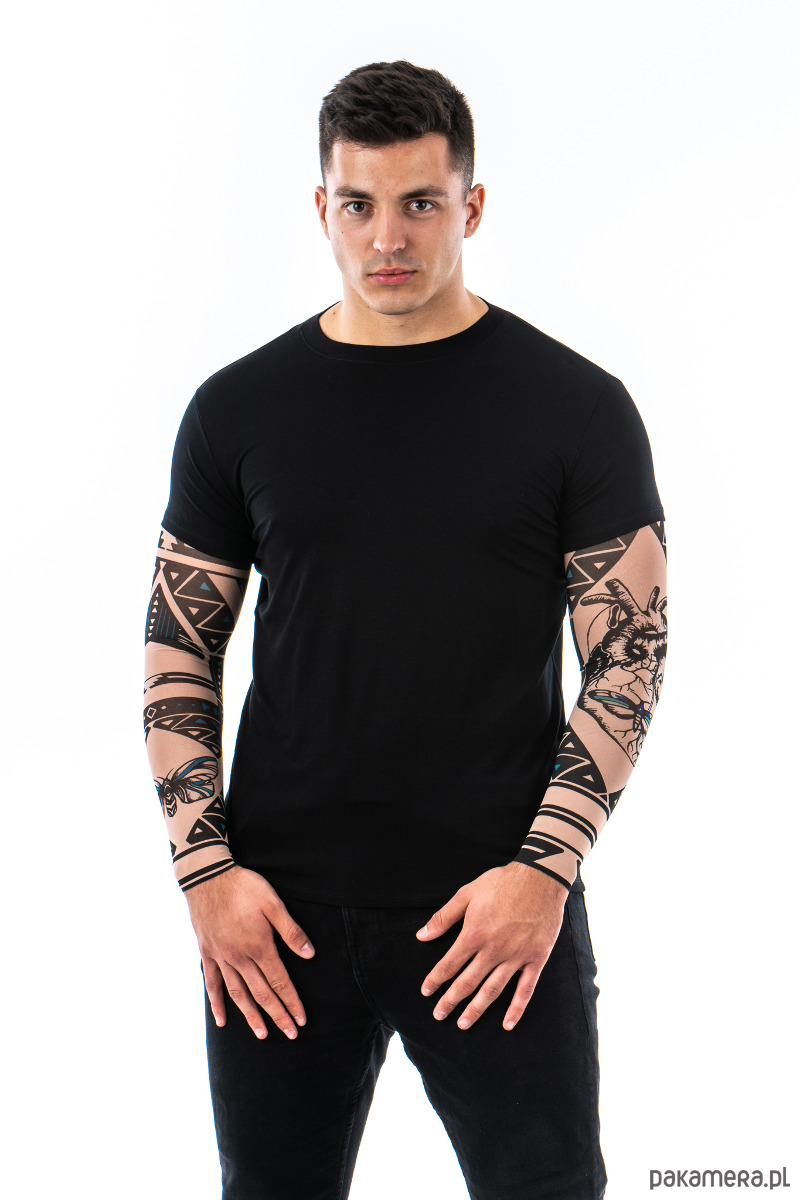 Materiał z którego wykonane są rękawy to przyjemna w dotyku elastyczna siateczka. Jej kolorystyka bardzo dobrze pasuje do koloru skóry, dzięki czemu wykonane na niej nadruki tatuażu wyglądają bardzo realistycznie, nawet z bliskiej odległości. Jest jednocześnie cienka i delikatna oraz mocna i trwała. Materiał z którego wykonana jest koszulka to wysokiej jakości mieszanka wiskozy i elastanu, dzięki czemu t-shirt nie tylko komfortowo się nosi oraz dobrze dopasowuje się do ciała, ale też na długo zachowuje oryginalny wygląd. Nadruk tatuażu na rękawkach został wykonany trwałą metodą i nawet przy dłuższym użytkowaniu oraz po praniu kolory zachowują oryginalny wygląd i intensywność.