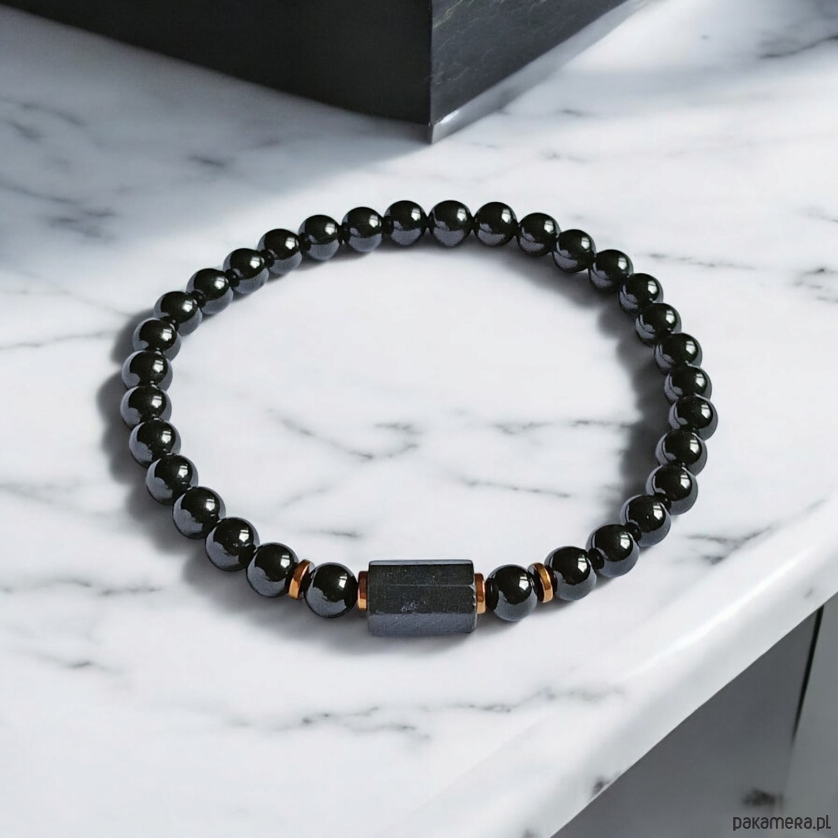 Bransoletka wykonana z czarnego turmalinu w dwóch formach (bryłka surowa, ciosana oraz gładkie kule błysk 6mm).