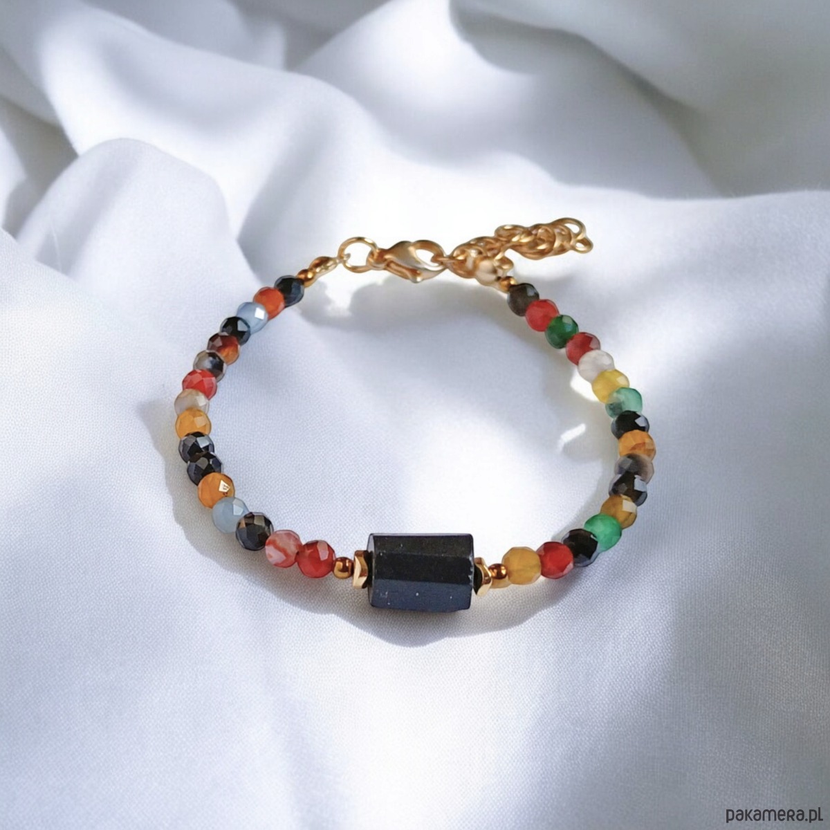Bransoletka na solidnej lince stalowej (miękkiej) - została wykonana z wielobarwnego agatu (fasetowane kule 4mm),przekładek ze złotego hematytu i bryłki czarnego turmalinu.