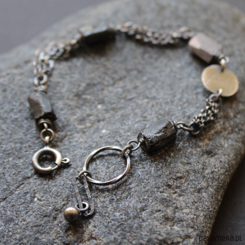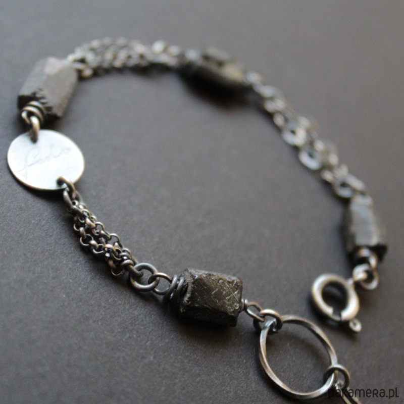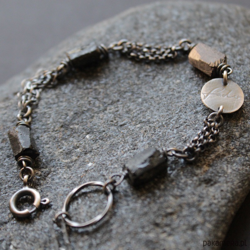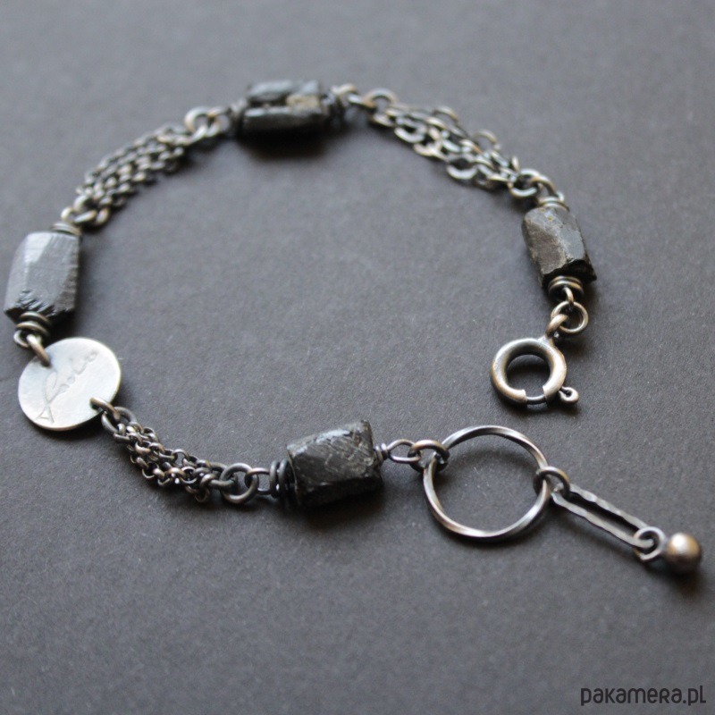 Bransoletka wykonana została z oksydowanego srebra próby 925 oraz bryłek surowych, czarnych turmalinów (0,7-0,9 cm).