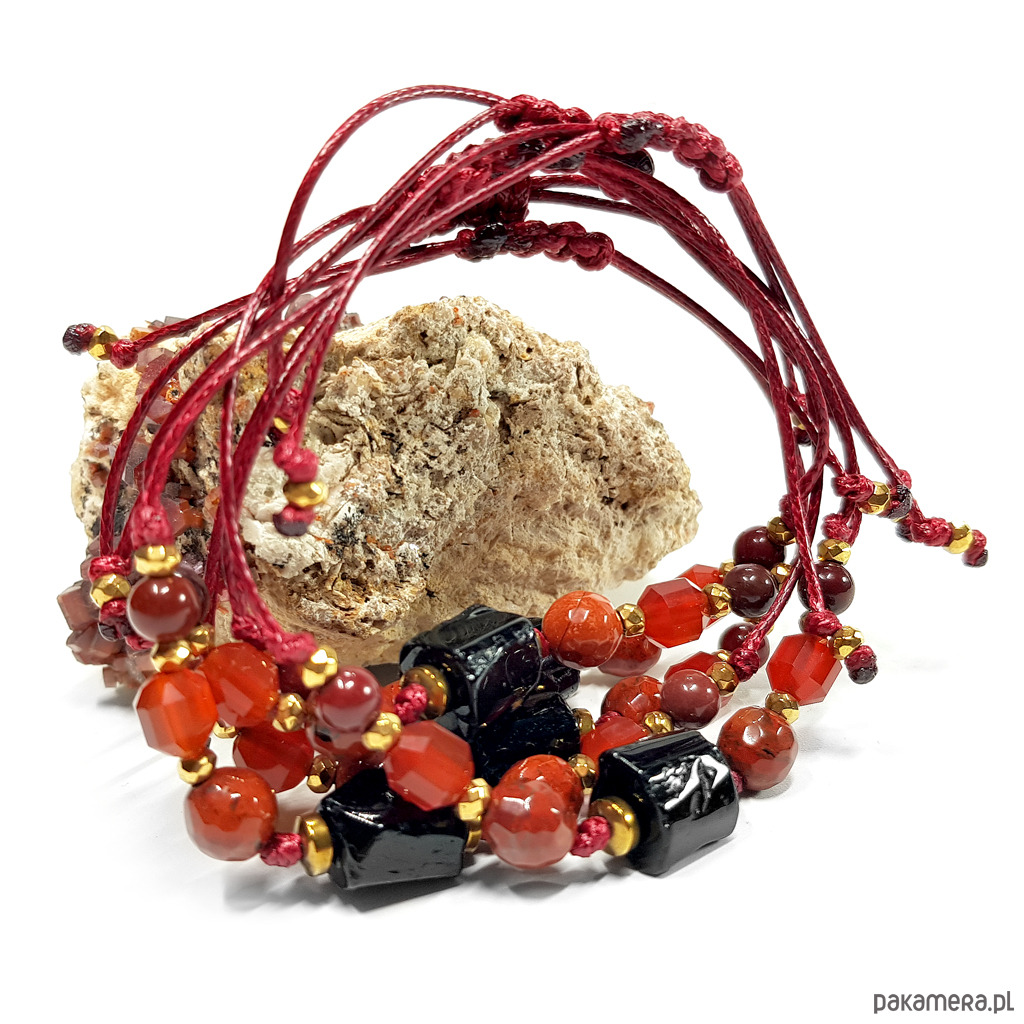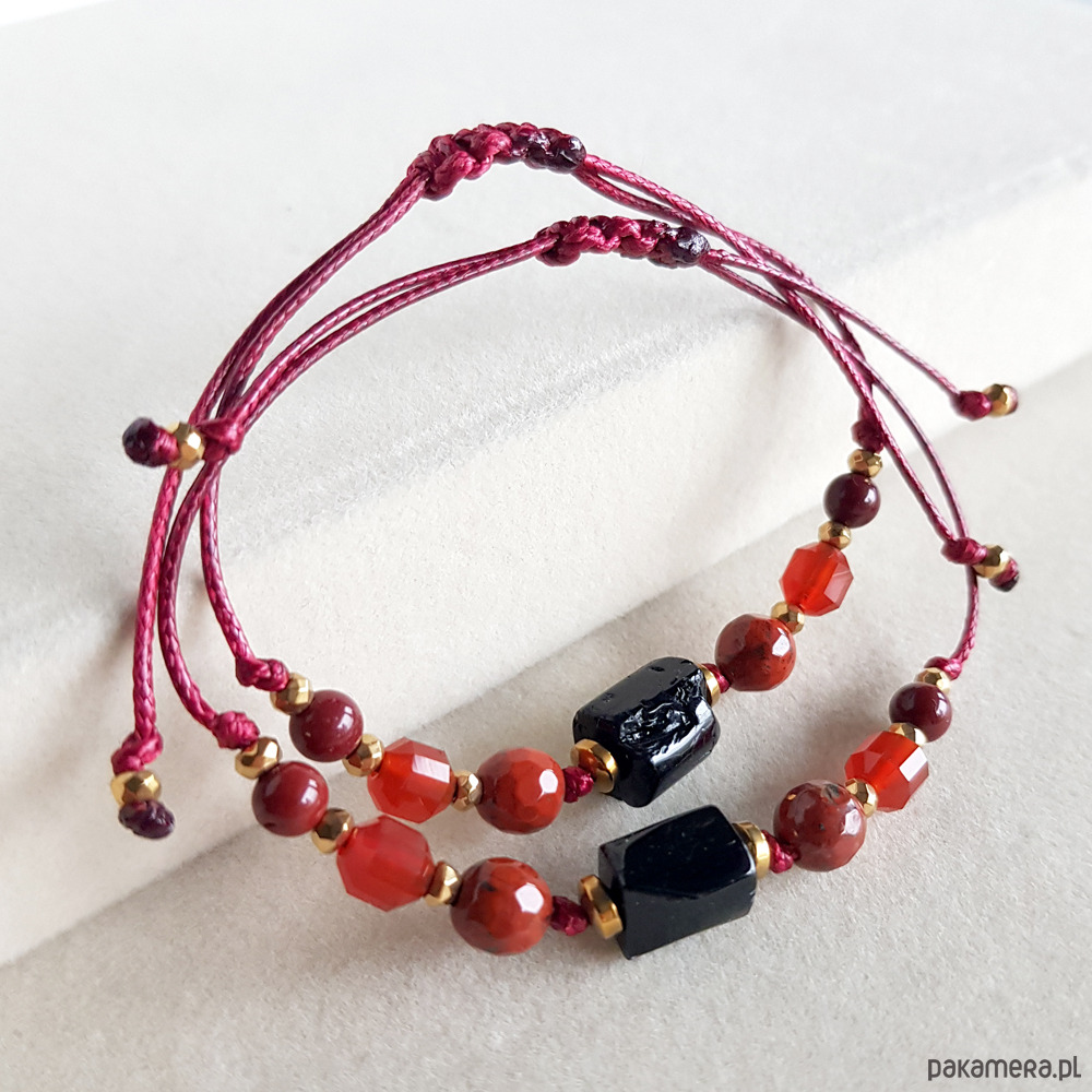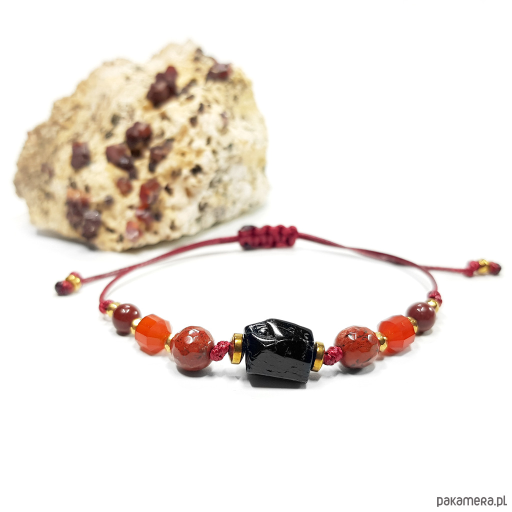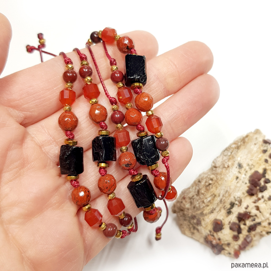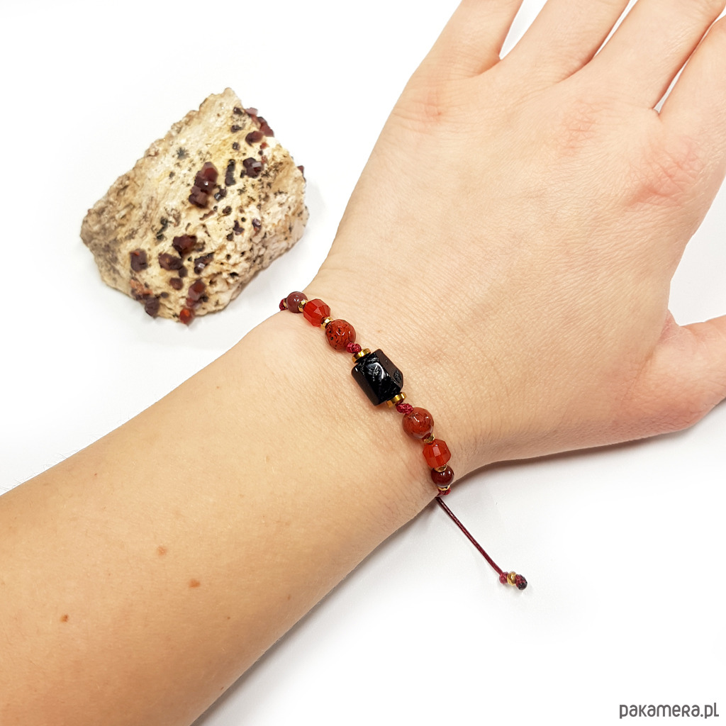 Bransoletka wykonana z czarnego turmalinu, karneolu, jaspisu czerwonego i hematytu oraz mocnego sznureczka. Bransoletka będzie odpowiednia na nadgarstek o obwodzie 12-17 cm.
