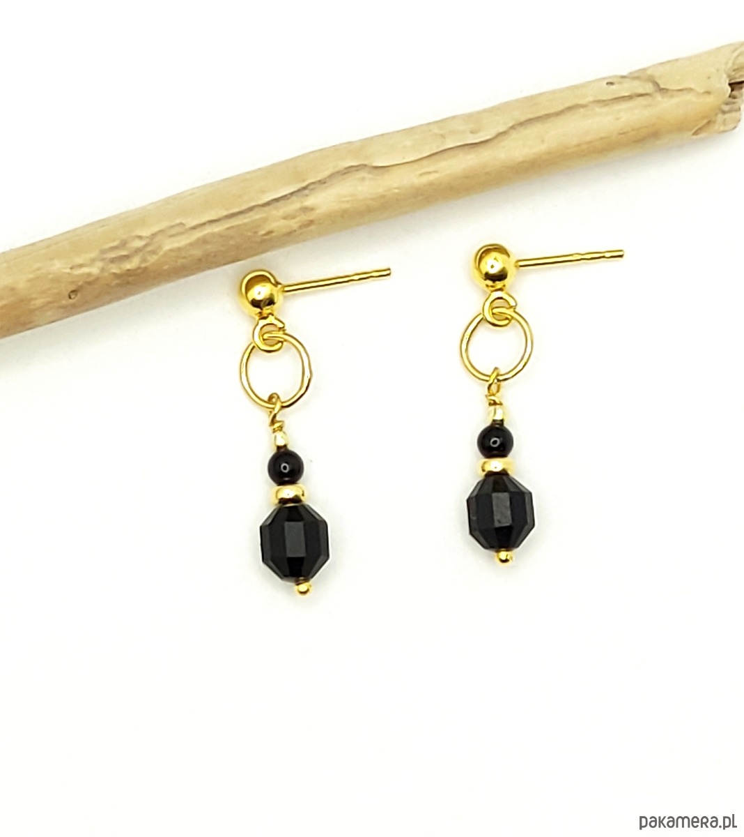 Delikatne, kobiece, idealne na co dzień. Szlifowane kamienie turmalinu w ładnej bryłce z dodatkiem pozłacanego srebra są zawieszone na kółeczku i sztyfcie z kuleczką. Połączenie czerni i złota zawsze elegancko wygląda i dodaje szyku każdej stylizacji.