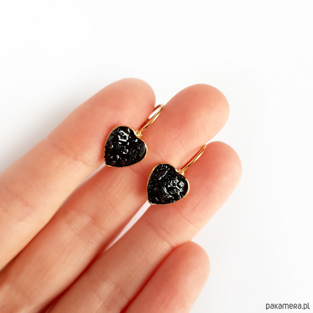 Kolczyki wykonane ręcznie z metalowych baz ze stali chirurgicznej oraz czarnego turmalinu zatopionego w żywicy jubilerskiej.