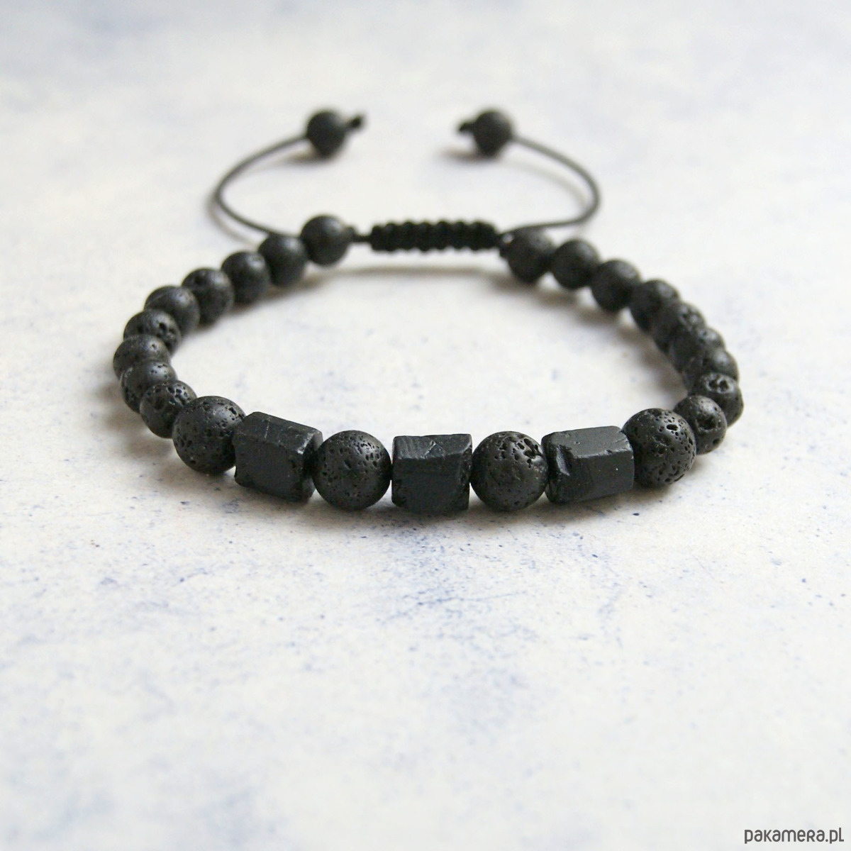 TUTAJ: ochronna bransoletka męska NA SOLIDNYM SZNURECZKU NYLONOWYM wykonana z 3 nieregularnych bryłek surowego czarnego turmalinu (ok. 10mm), porowatej lawy wulkanicznej (8 i 6mm) .
