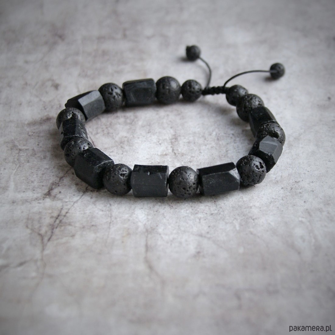 TUTAJ: niezwykle okazała bransoleta męska NA SOLIDNYM SZNURECZKU NYLONOWYM wykonana z nieregularnych bryłek surowego czarnego turmalinu (9-10/ 11-14mm), porowatej lawy wulkanicznej (10mm) .