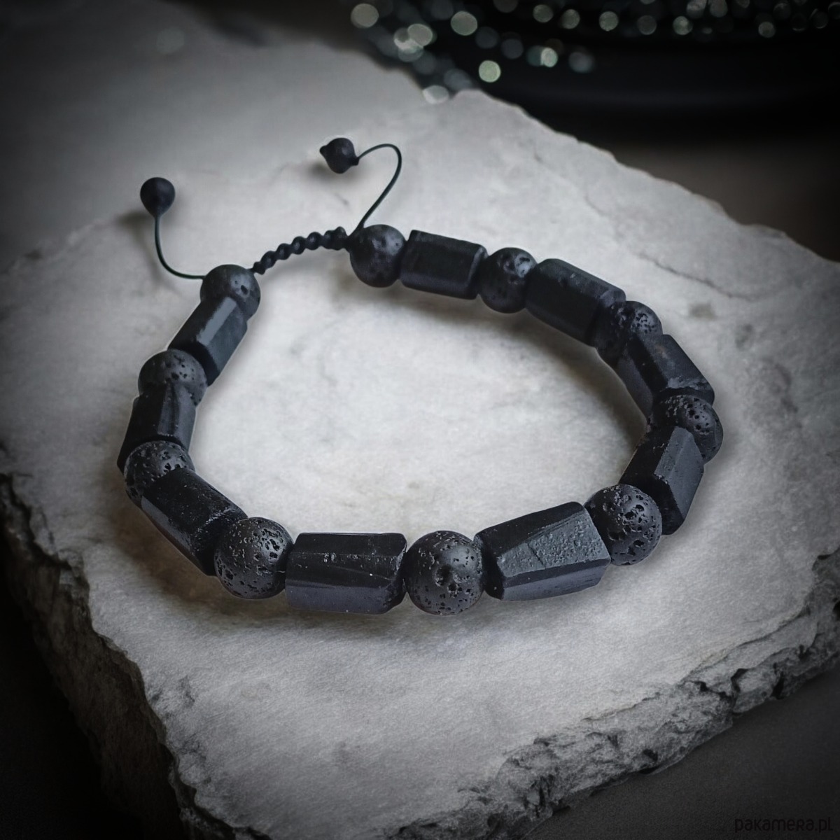TUTAJ: niezwykle okazała bransoleta męska NA SOLIDNYM SZNURECZKU NYLONOWYM wykonana z nieregularnych bryłek surowego czarnego turmalinu (9-10/ 11-14mm), porowatej lawy wulkanicznej (10mm) .