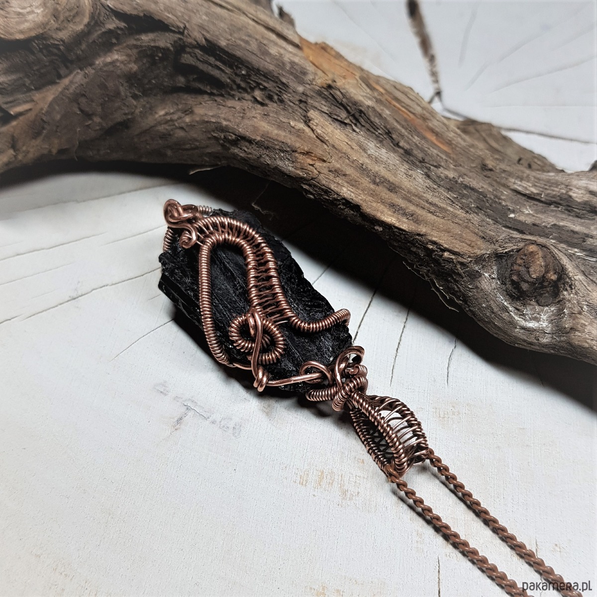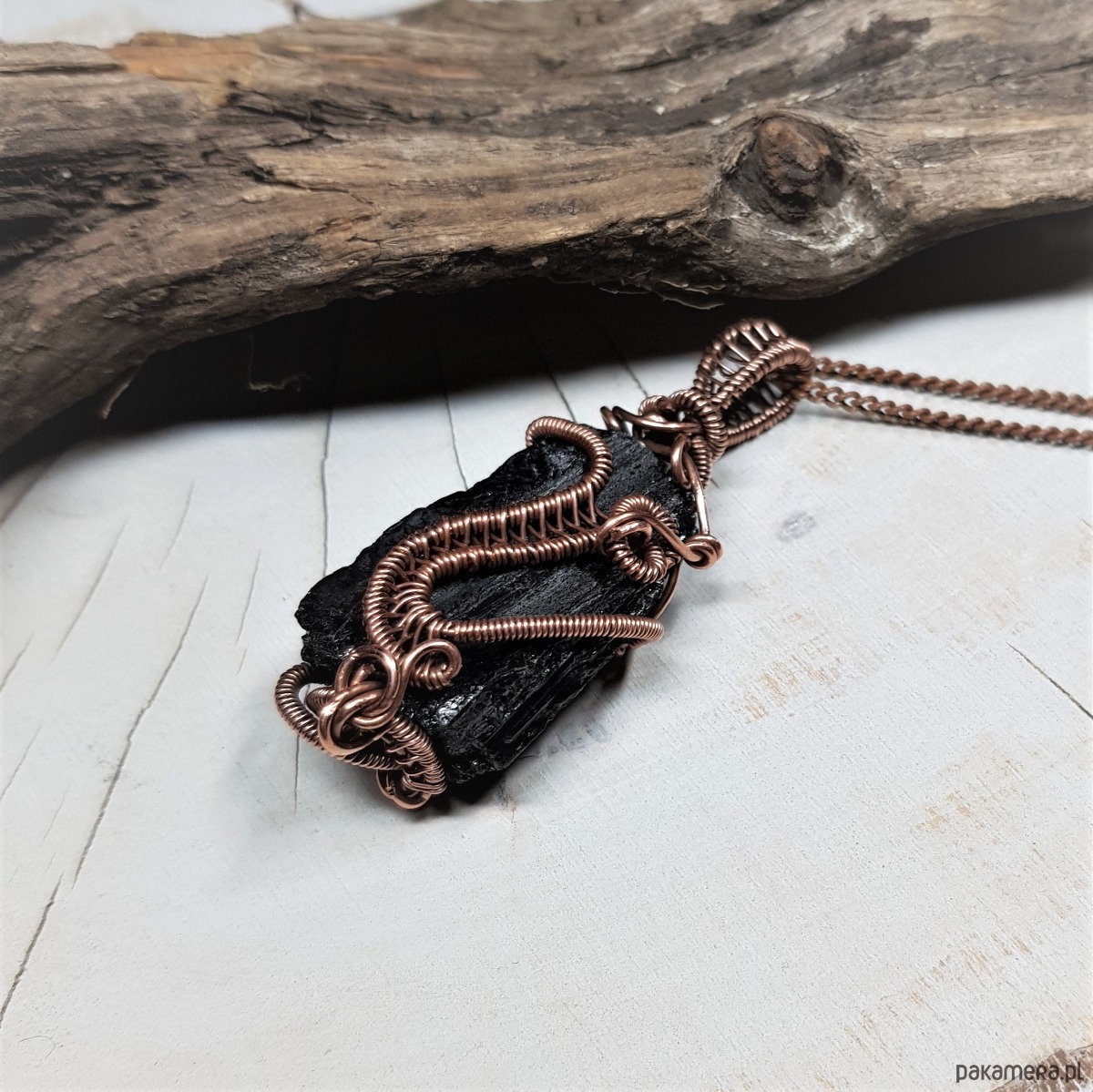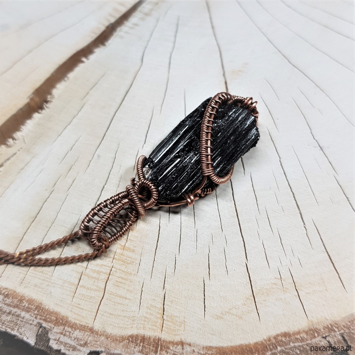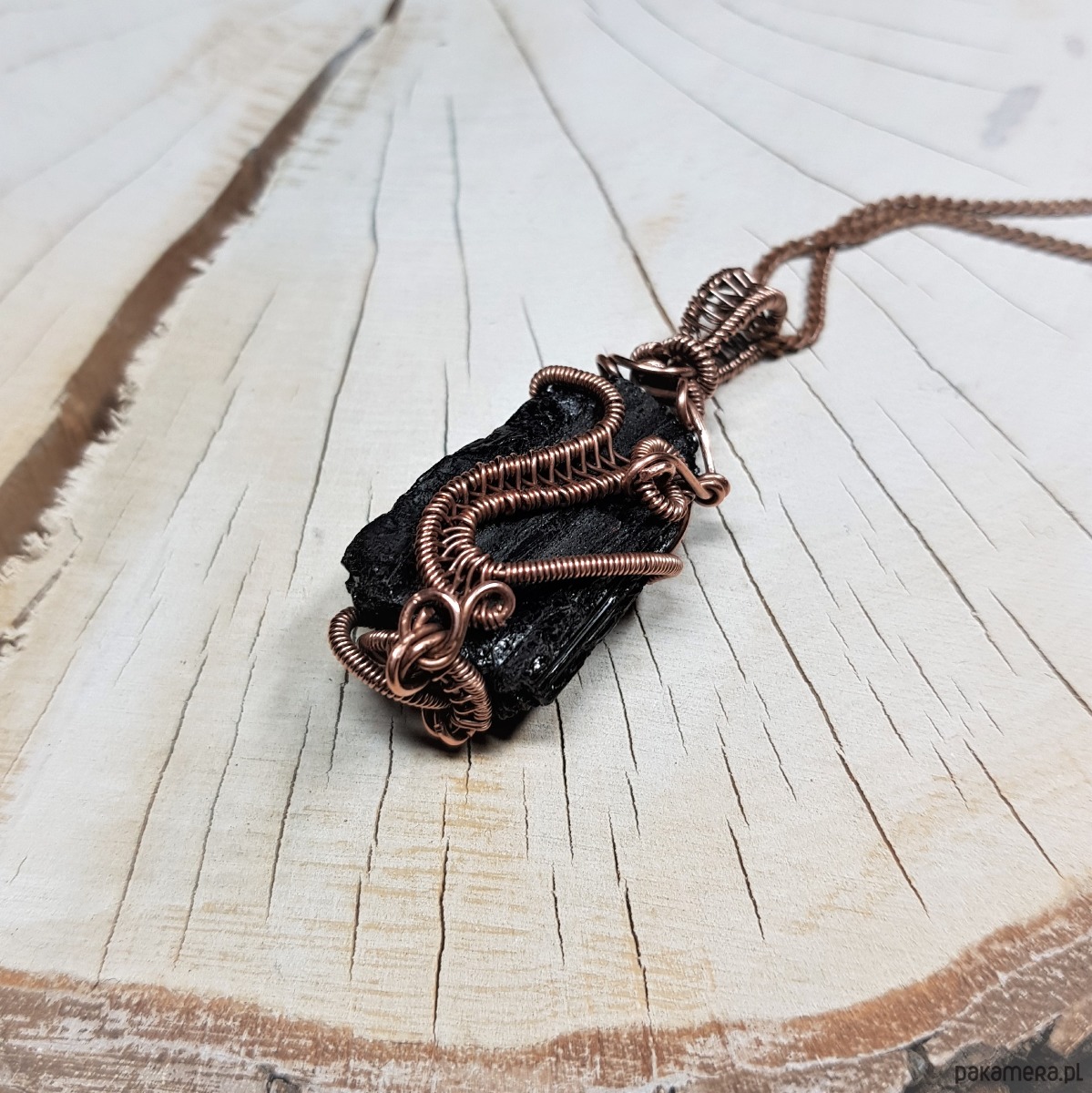 Dwustronny wisiorek wykonany ręcznie w miedzi metodą wire-wrappingu z naturalnego czarnego turmalinu, przyciemniony oksydą i wypolerowany w celu uzyskania szlachetnego efektu postarzenia. Wymiary wisiorka 52x18mm, z łańcuszkiem o długości około 50 cm.