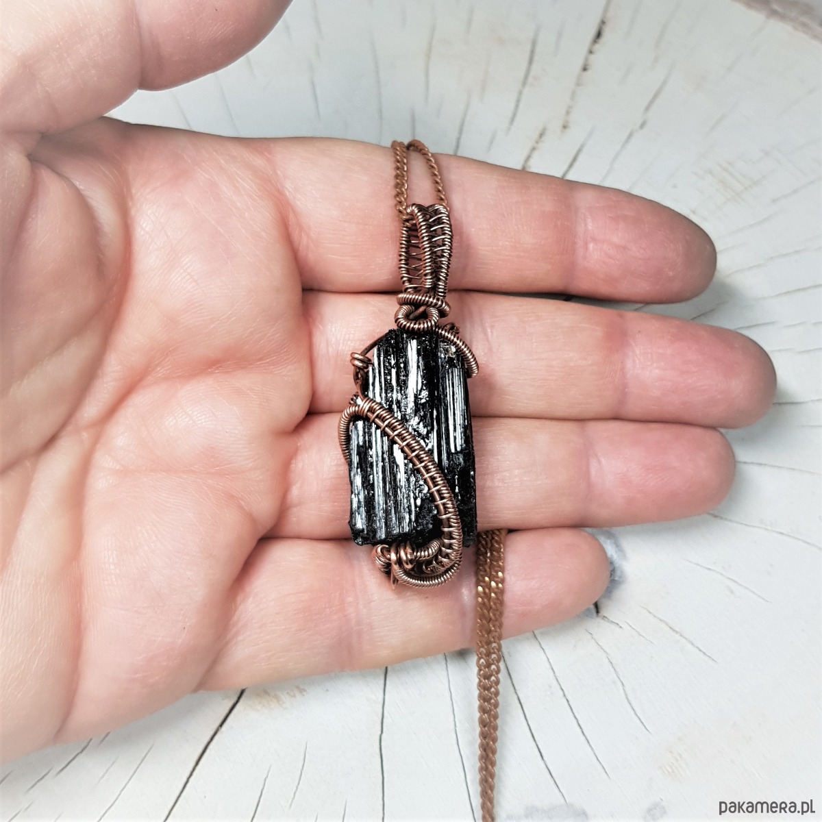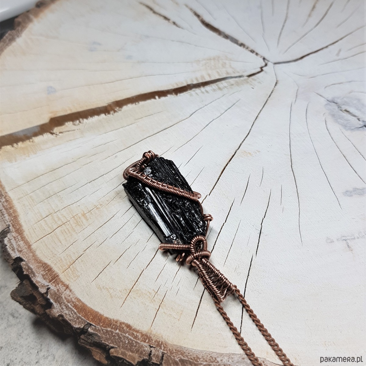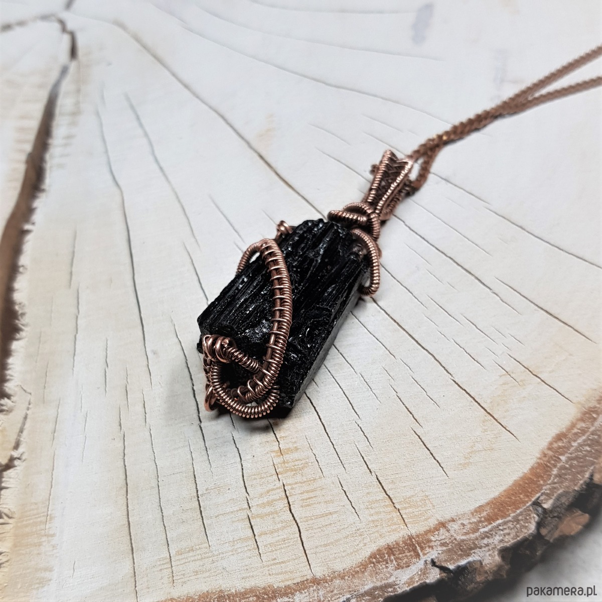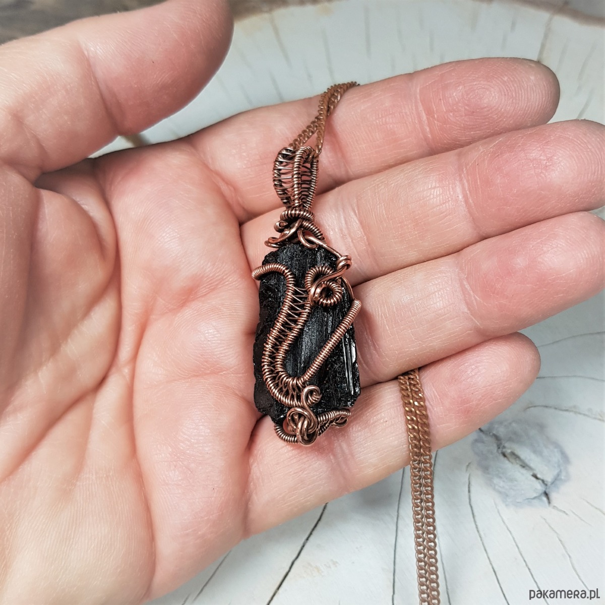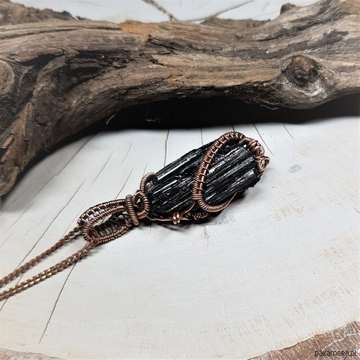 Dwustronny wisiorek wykonany ręcznie w miedzi metodą wire-wrappingu z naturalnego czarnego turmalinu, przyciemniony oksydą i wypolerowany w celu uzyskania szlachetnego efektu postarzenia. Wymiary wisiorka 52x18mm, z łańcuszkiem o długości około 50 cm.