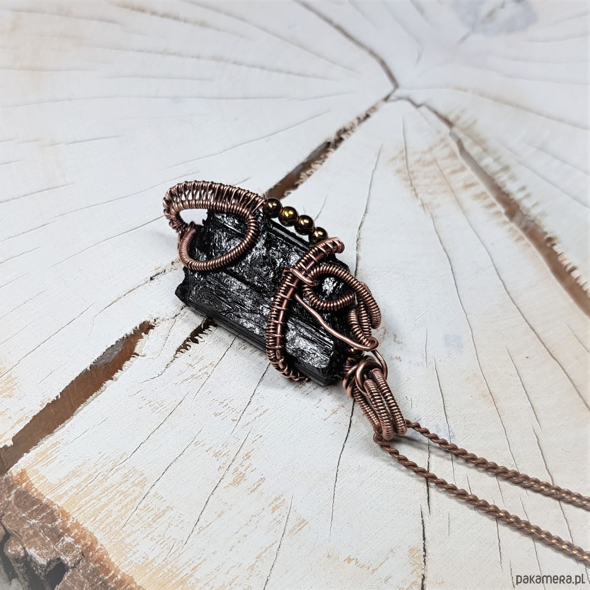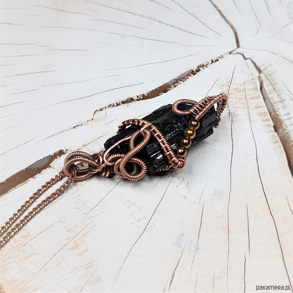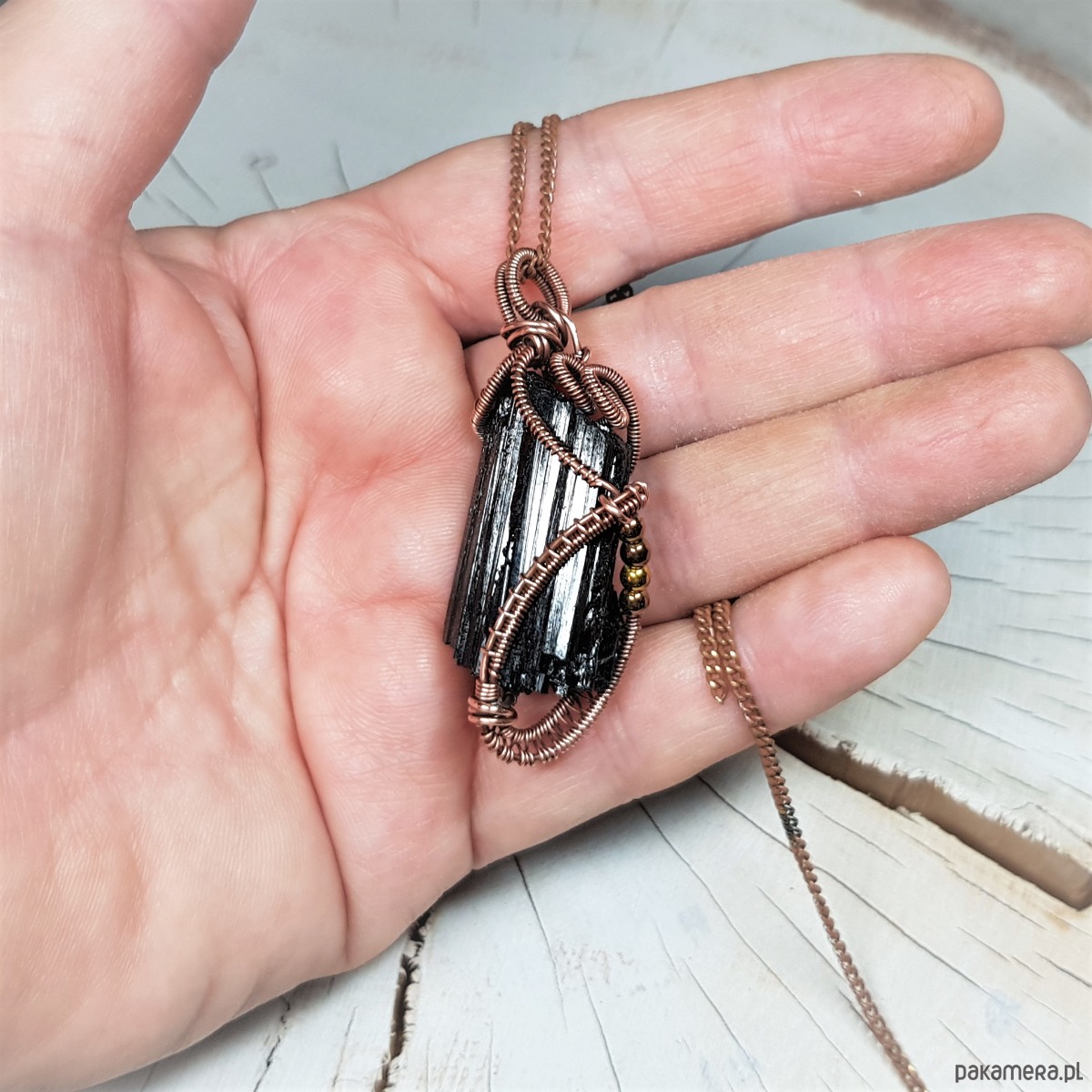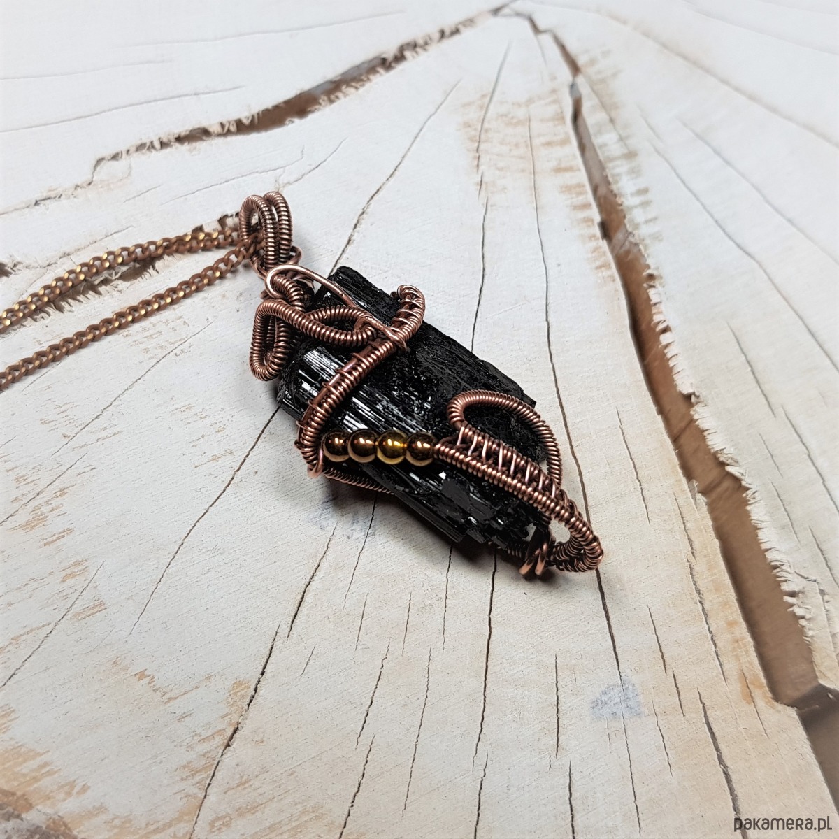 Dwustronny wisiorek wykonany ręcznie w miedzi metodą wire-wrappingu z naturalnego czarnego turmalinu, przyciemniony oksydą i wypolerowany w celu uzyskania szlachetnego efektu postarzenia. Wymiary wisiorka 55x24mm, z łańcuszkiem o długości około 50 cm.