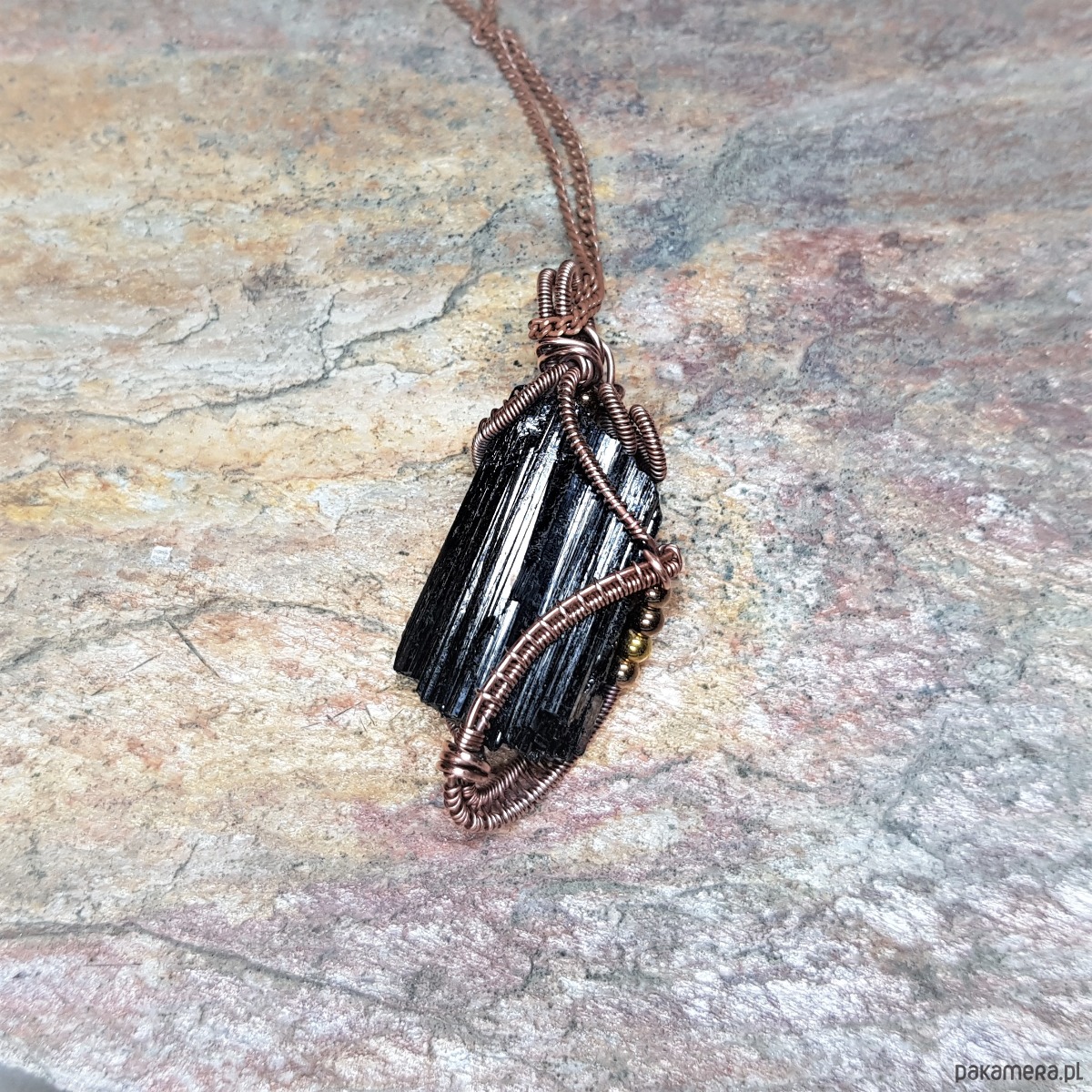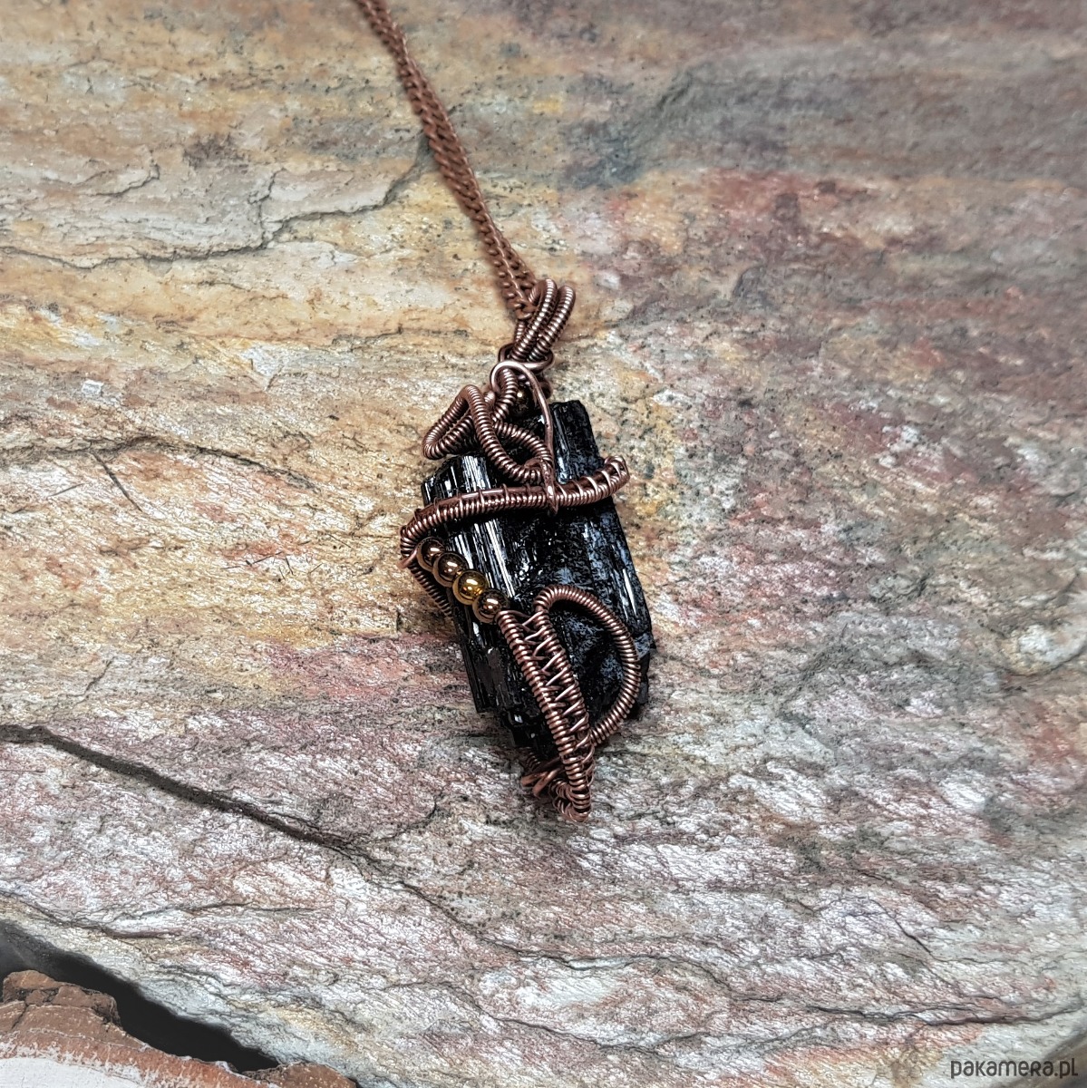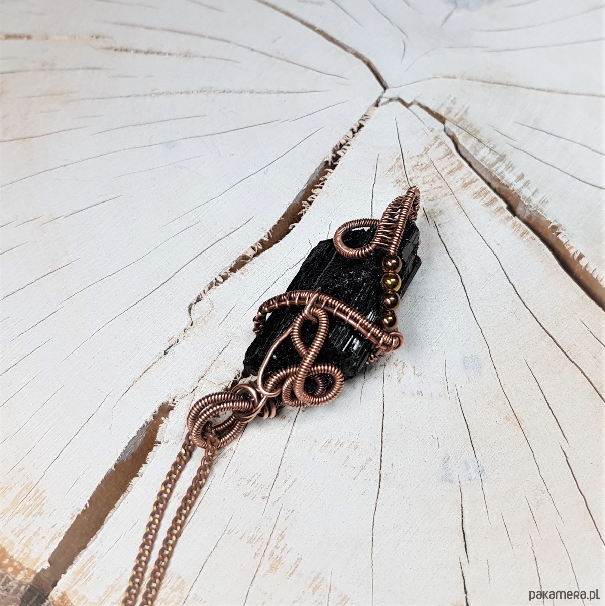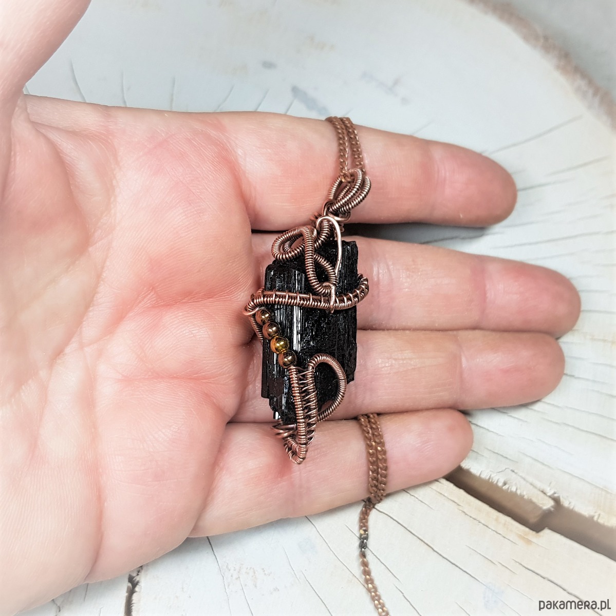Dwustronny wisiorek wykonany ręcznie w miedzi metodą wire-wrappingu z naturalnego czarnego turmalinu, przyciemniony oksydą i wypolerowany w celu uzyskania szlachetnego efektu postarzenia. Wymiary wisiorka 55x24mm, z łańcuszkiem o długości około 50 cm.