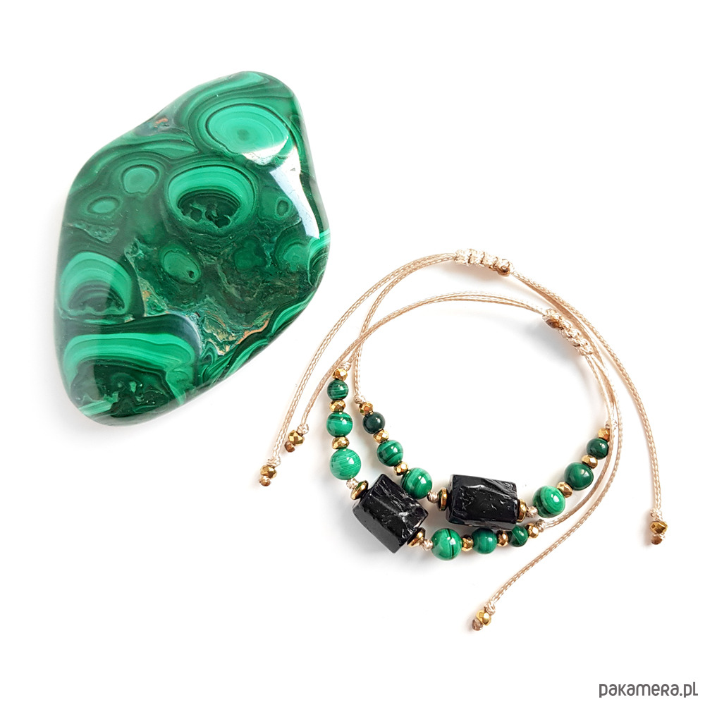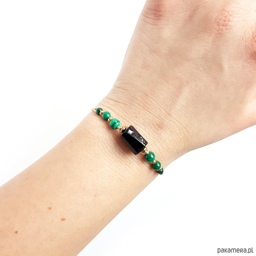 Bransoletka wykonana z czarnego turmalinu, malachitu i hematytu oraz mocnego sznureczka. Bransoletka będzie odpowiednia na nadgarstek o obwodzie 12-17 cm.