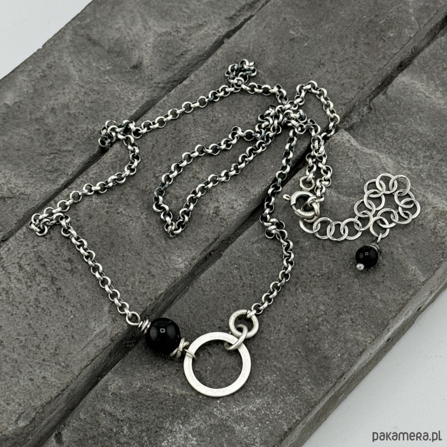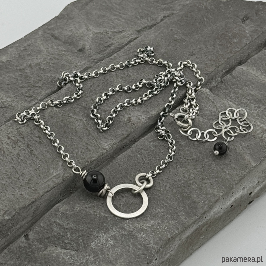 Subtelny i kobiecy naszyjnik na co dzień i nie tylko. Wykonany w całości z oksydowanego srebra próby 925 oraz kulki czarnego turmalinu wielkości ok. 0,6 cm. Wielkość koła to 1,2 cm . Obwód łańcuszka to 44 cm plus regulacja 5 cm. Ten naszyjnik mogę wykonać również w wersji nieoksydowanej lub z innym kamieniem. Ozdobnie zapakowany.