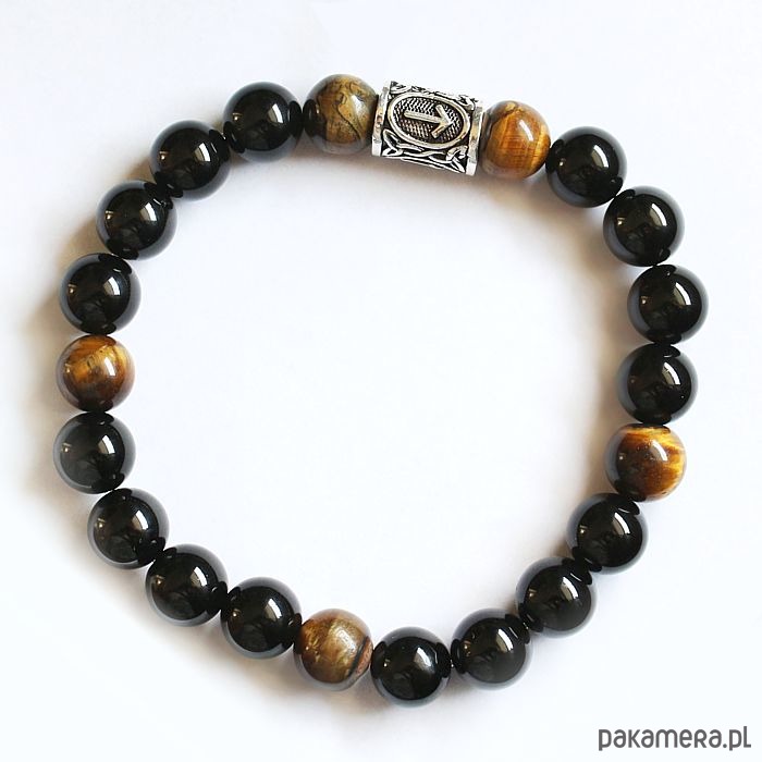 Męska energetyczna bransoletka ochronna z czarnym turmalinem, runą tiwaz i tygrysim okiem, wspierająca uzdrawianie czakry podstawy i sakralnej, proces odzyskiwania męskości i odporności energetycznej.