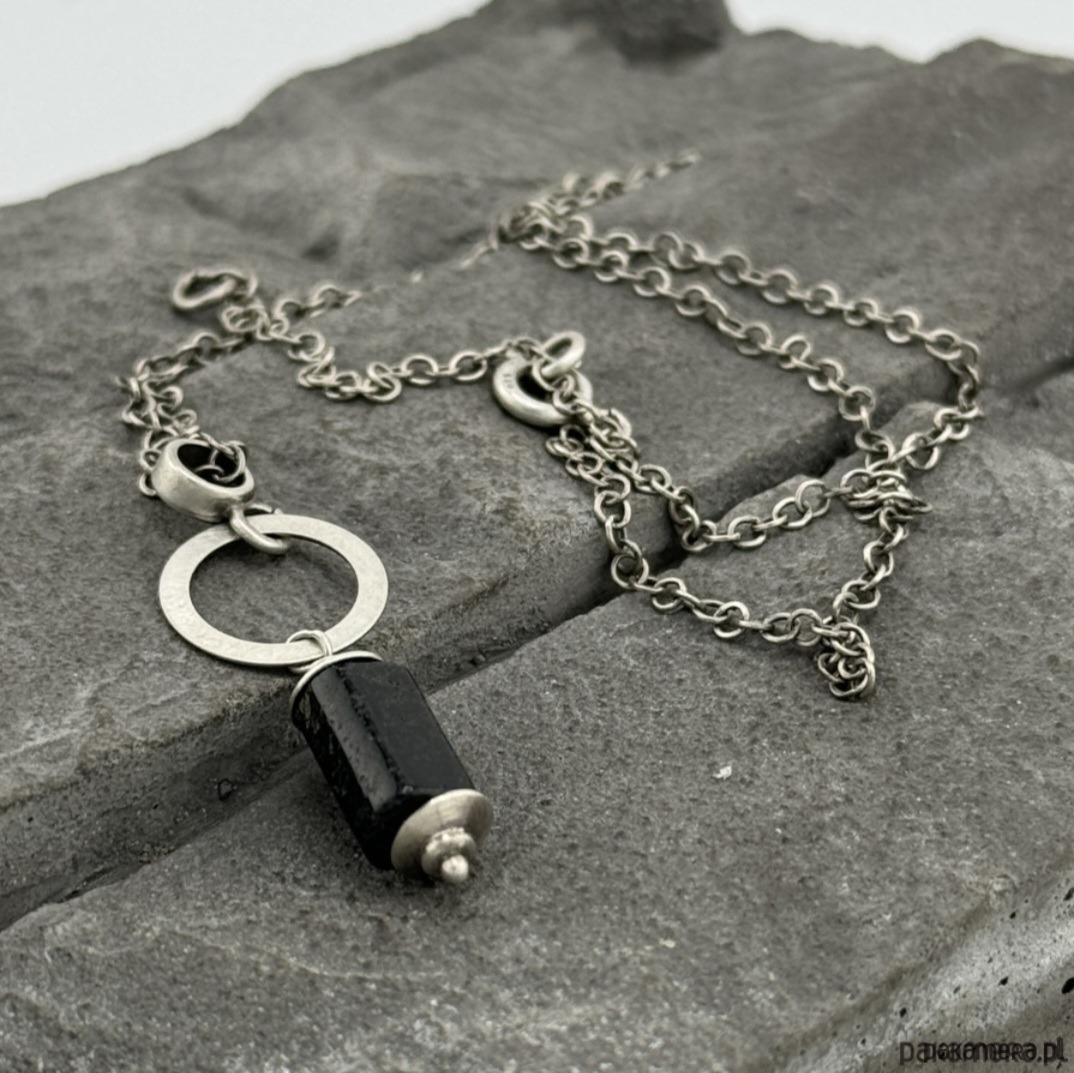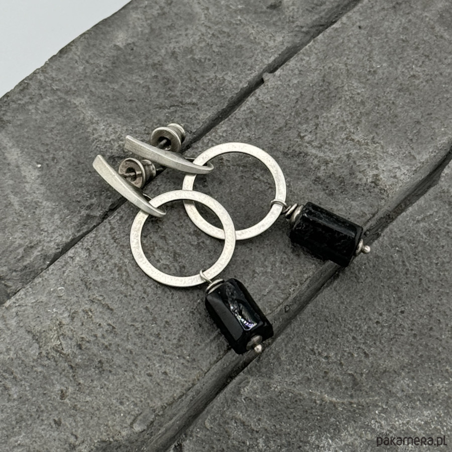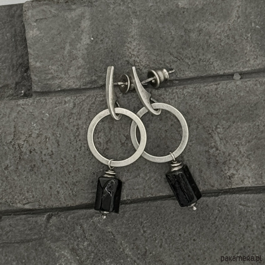 Kobiece, nowoczesne i oryginalne kolczyki na co dzień. Wykonane w całości ze srebra próby 925 oraz bryłek czarnego turmalinu wielkości ok. 1,1 cm x 0,7 cm. Zapięcia oryginalne sztyfty. Całkowita długość kolczyków to ok. 4 cm, kola maja srednice 1,6 cm. W mojej galerii naszyjnik do kompletu wifoczny na ostatnim zdjeciu. Ozdobnie zapakowane.