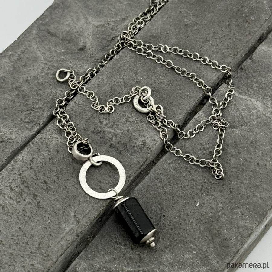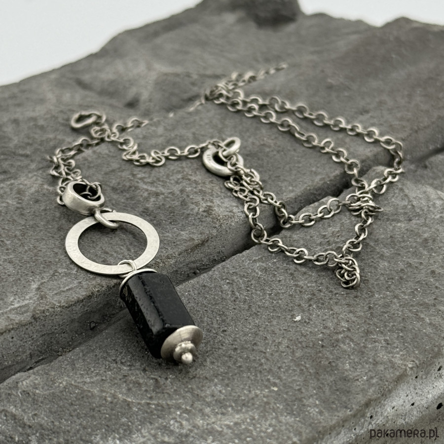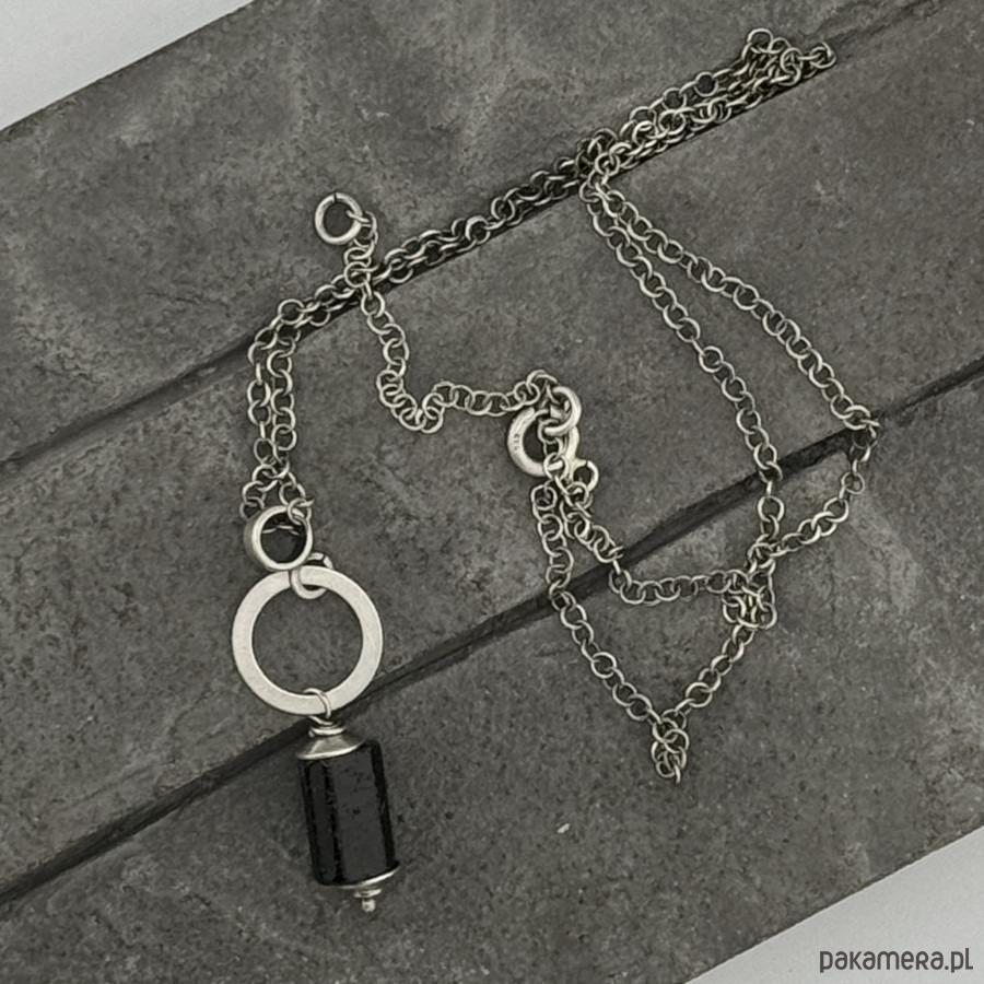 Subtelny, minimalistyczny i kobiecy naszyjnik na co dzień i nie tylko. Wykonany w całości z oksydowanego srebra próby 925 oraz bryłki naturalnego carnego turmalinu wielkości ok. 1,1 cm x 0,7 cm. Wielkość koła to 1,2 cm. Obwód łańcuszka to 45 cm lub 50 cm. W mojej galerii kolczyki do kompletu. Ozdobnie zapakowany.