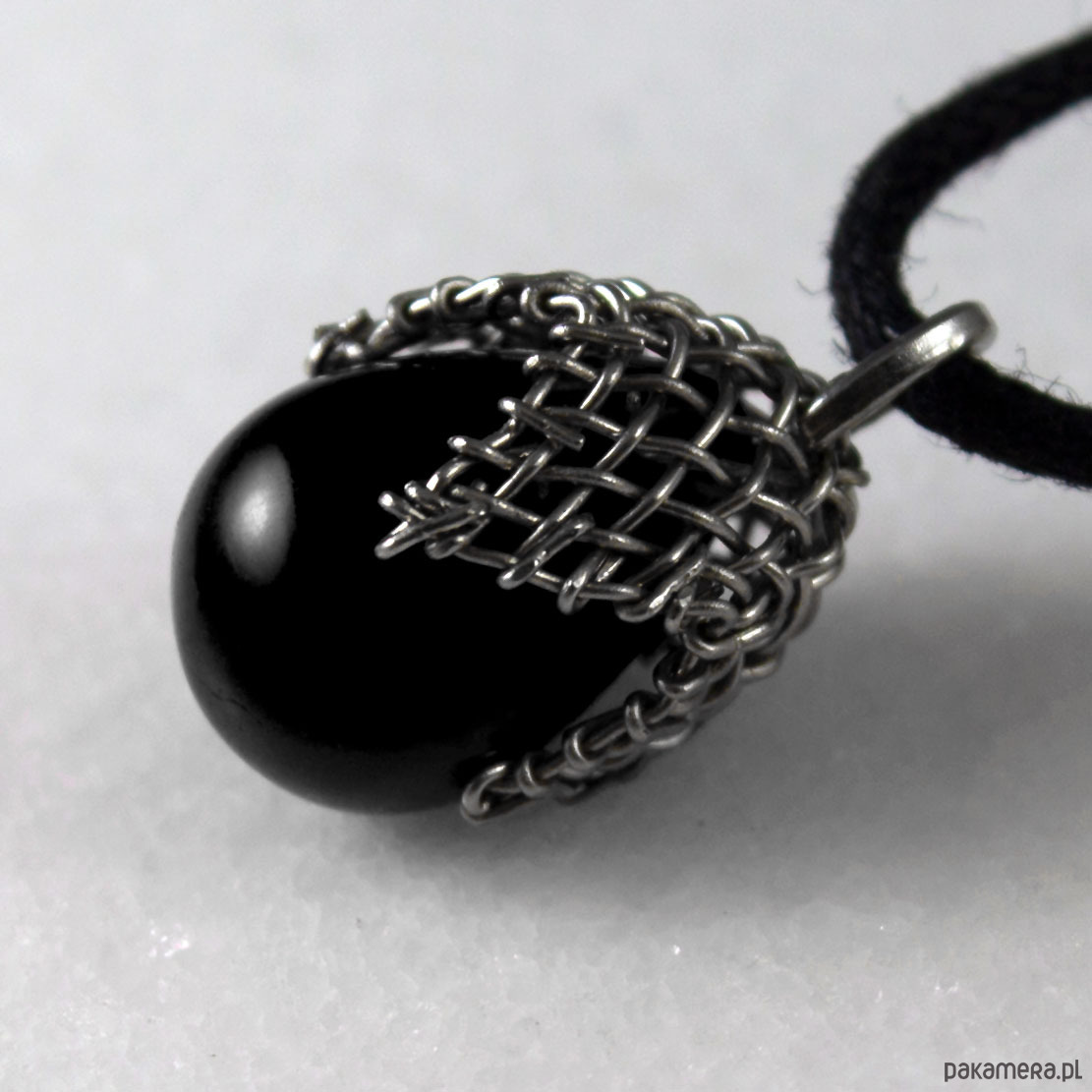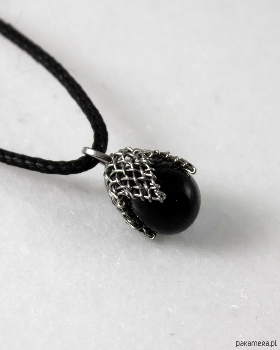 Szklana kropla oprawiona w ręcznie formowaną metalową siateczkę. Całkowita wielkość wisiorka to ok. 2 cm. W komplecie bawełniany sznurek do zawieszenia.